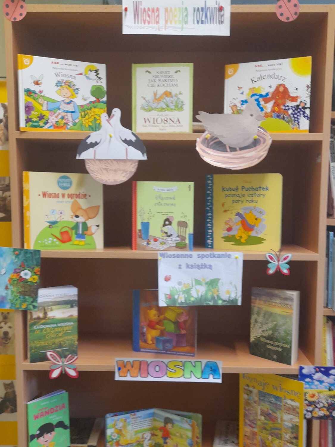 Z okazji nadejścia wiosny, nasza biblioteka szkolna zmieniła swój wystrój. Przygotowana została także specjalna wystawa książek o tematyce wiosennej. Na wystawie znalazły się zarówno klasyczne opowieści, jak i nowoczesne książki dla młodzieży, wszystkie poświęcone tej pięknej porze roku.