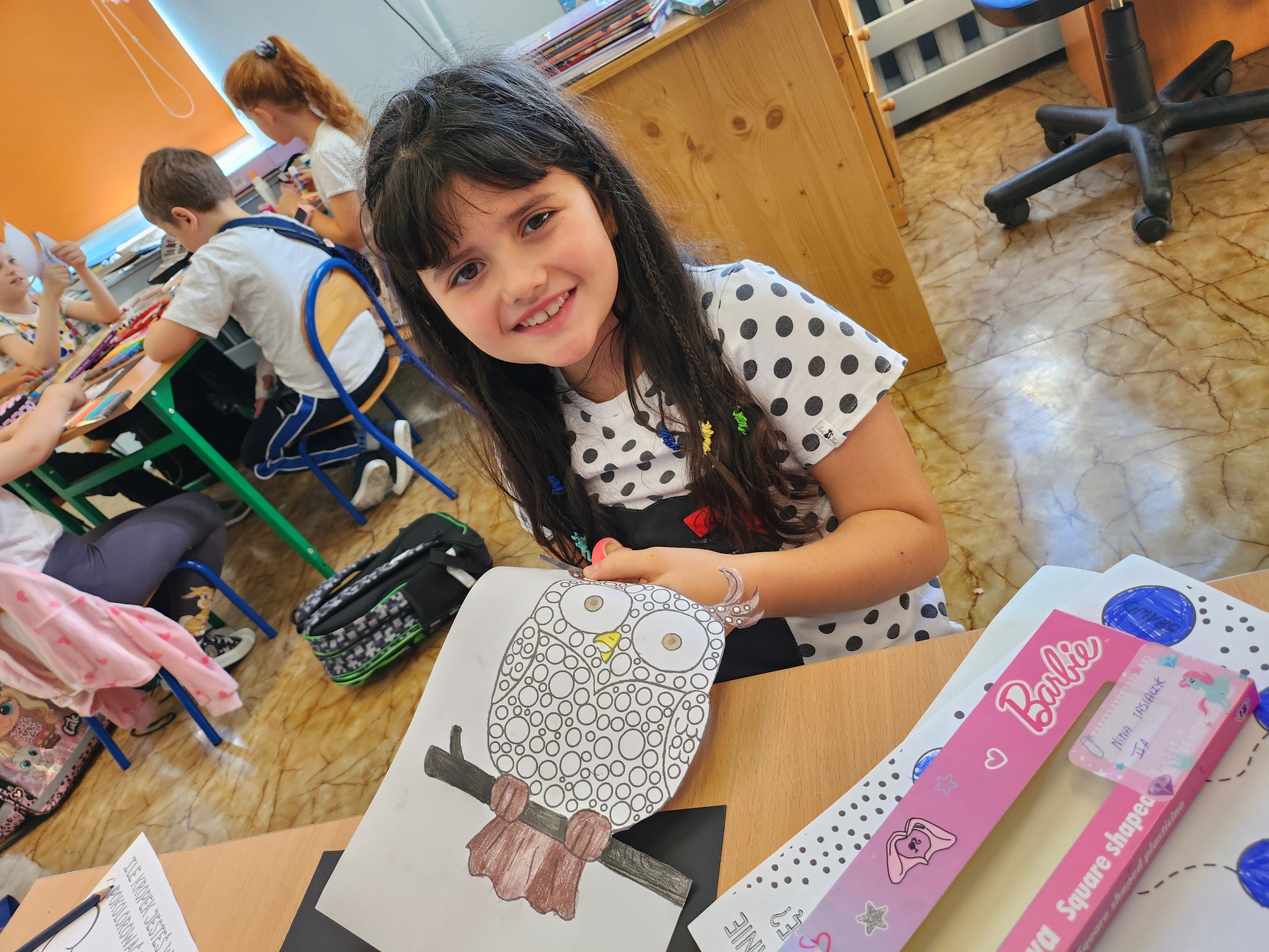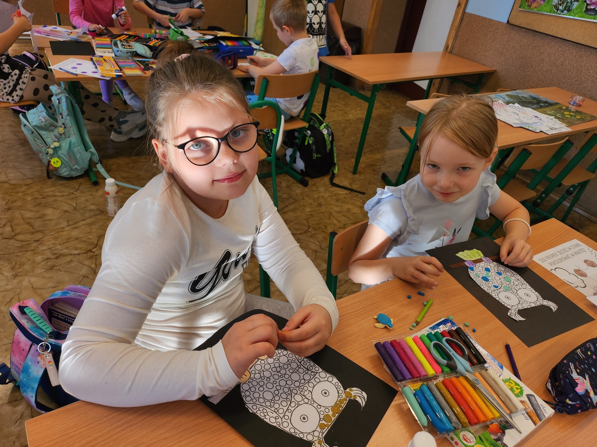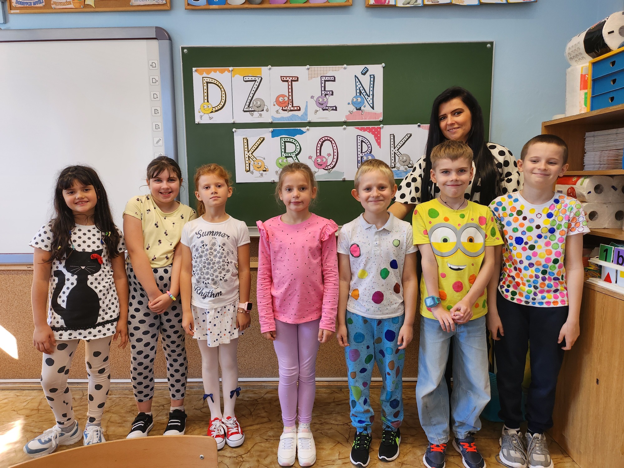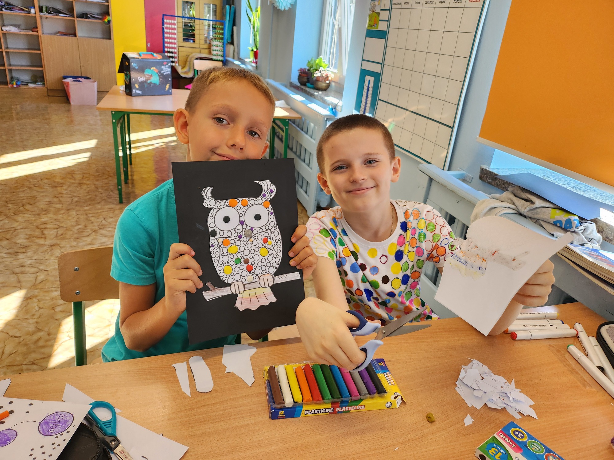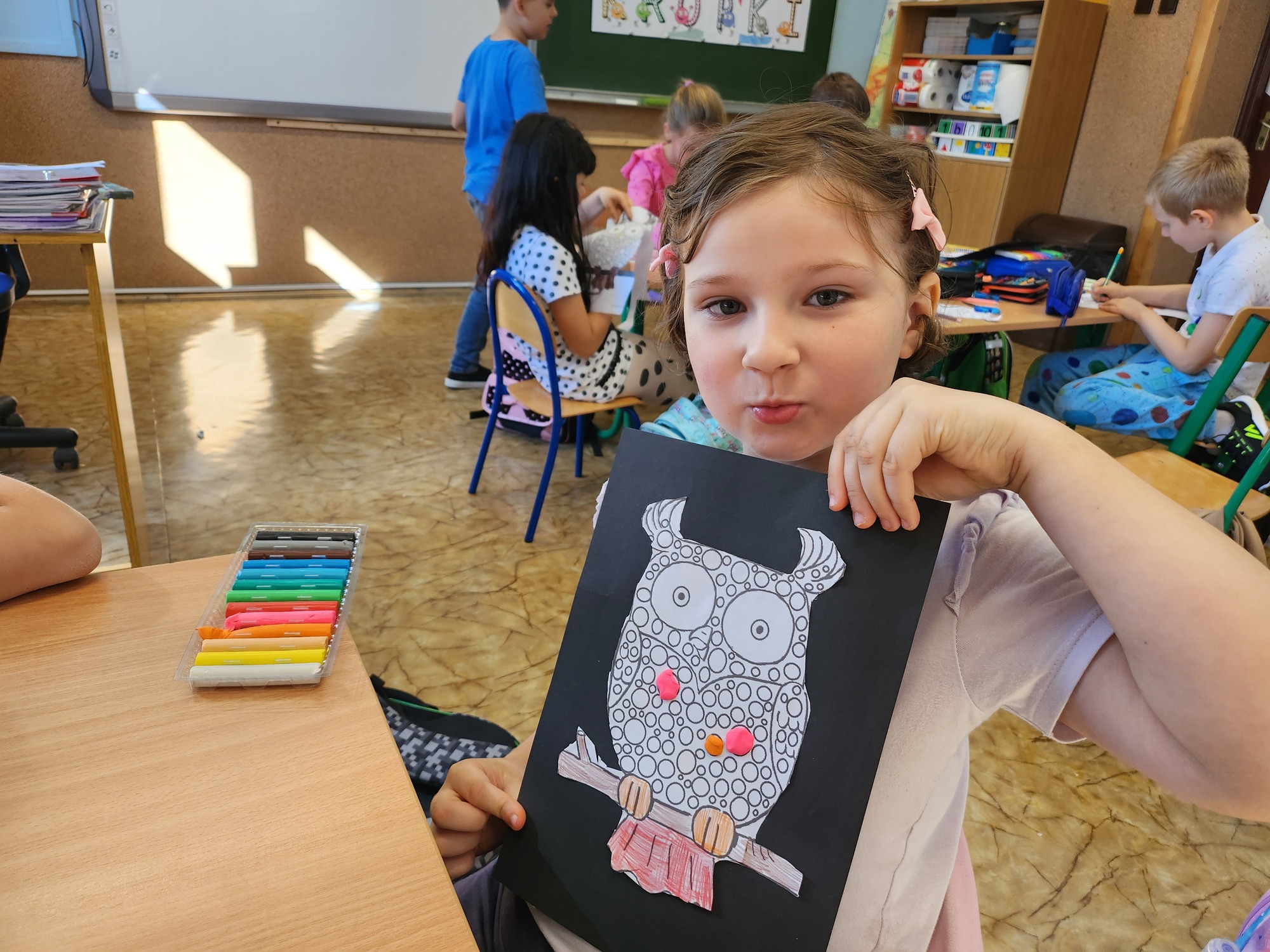W klasie rozbrzmiewały również kropkowe piosenki, które wprowadziły wszystkich w radosny nastrój. Na zakończenie uczniowie wykonali niezwykłą pracę plastyczną – „wykropkowaną sowę”, która teraz zdobi klasową tablicę.