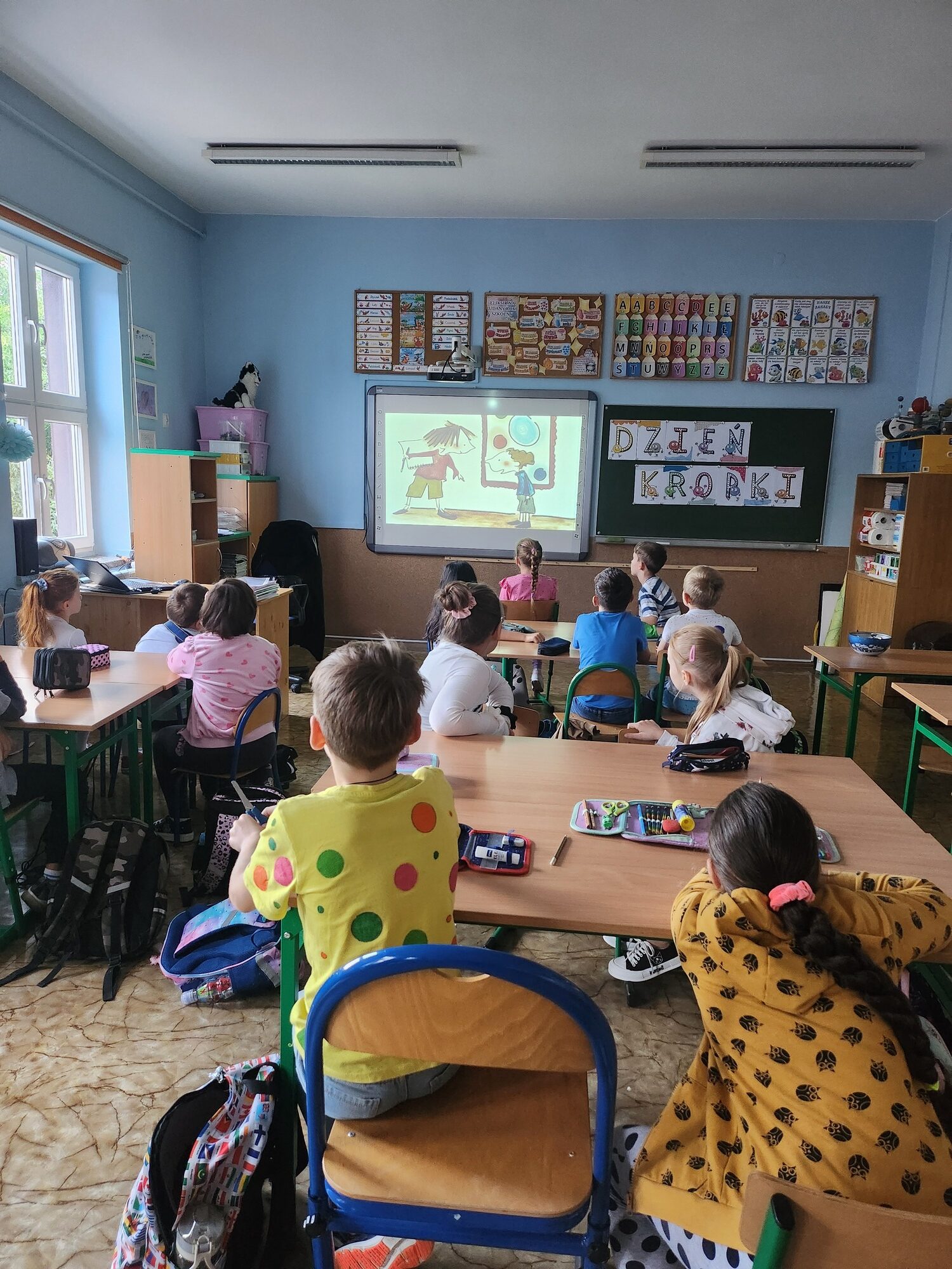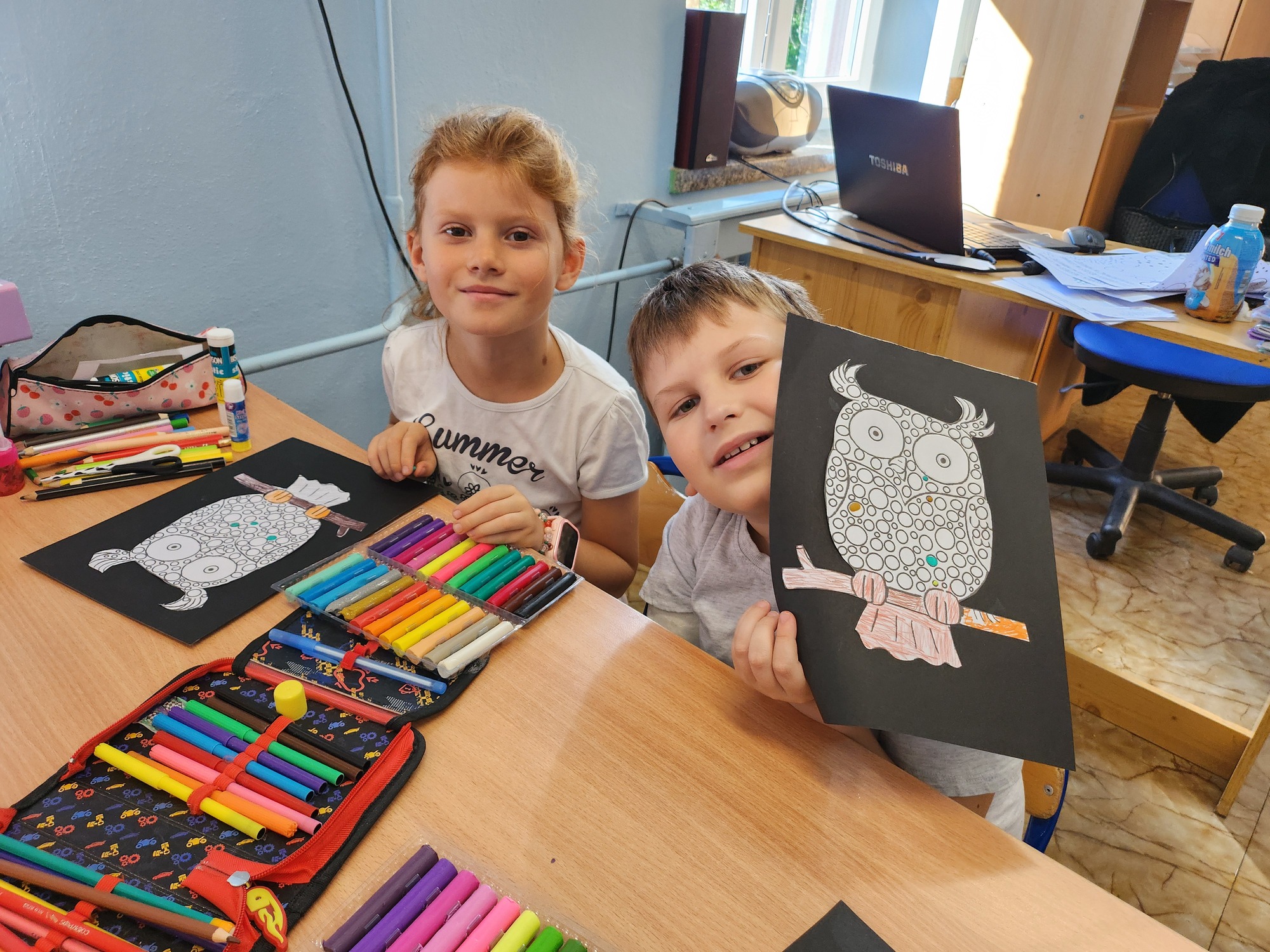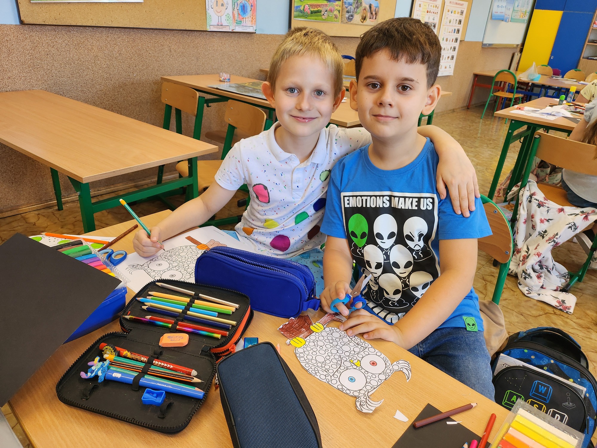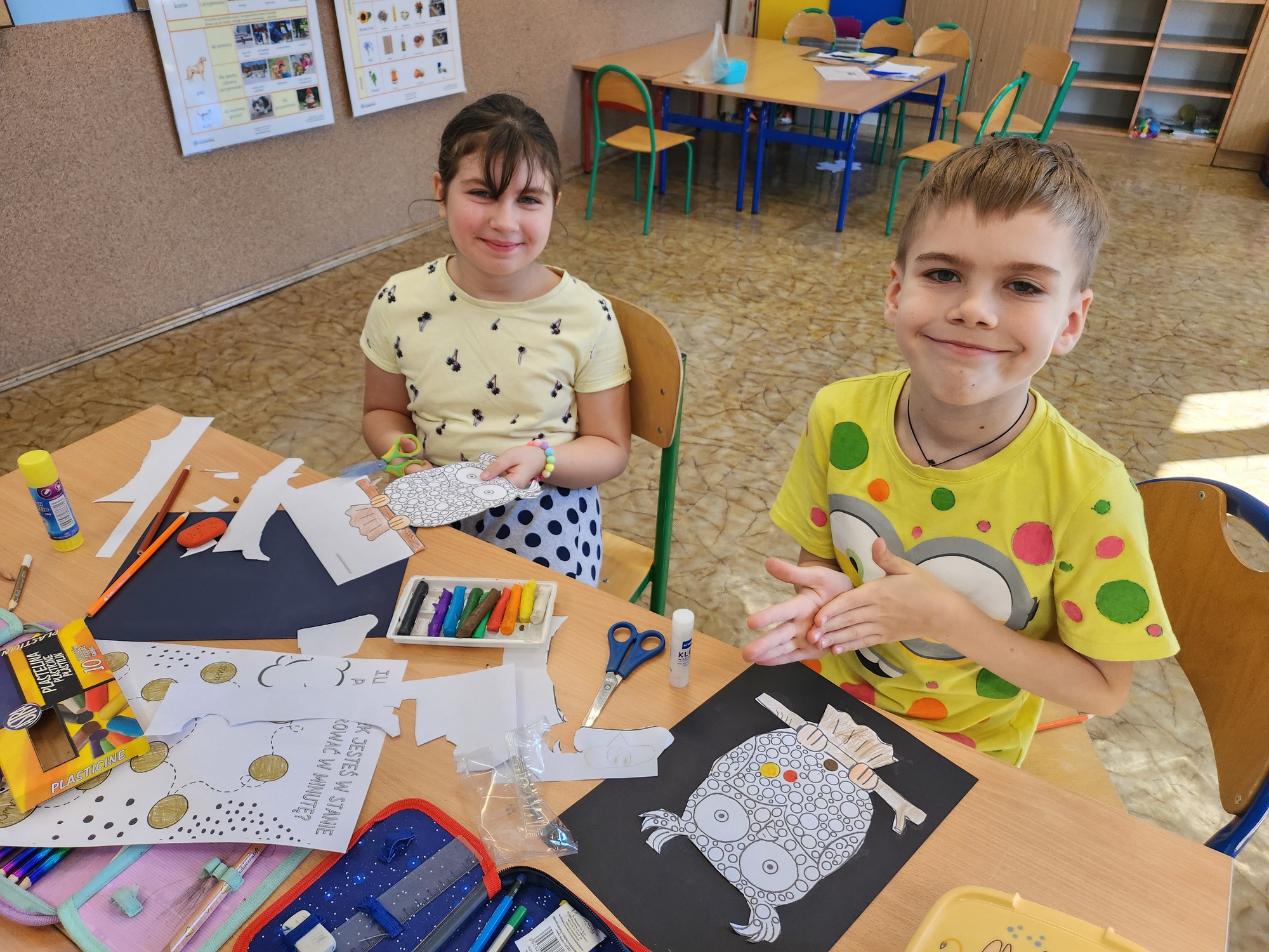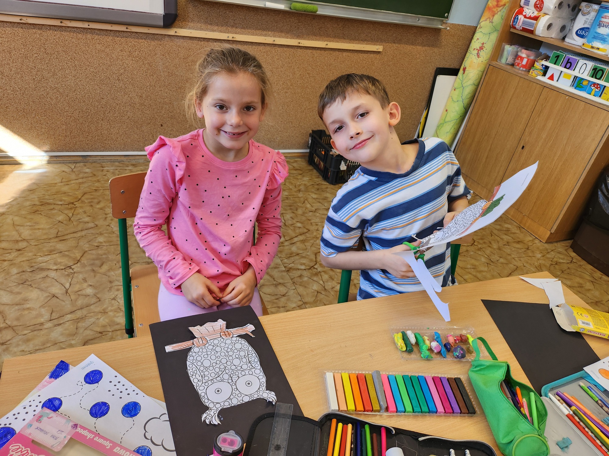 W klasie rozbrzmiewały również kropkowe piosenki, które wprowadziły wszystkich w radosny nastrój. Na zakończenie uczniowie wykonali niezwykłą pracę plastyczną – „wykropkowaną sowę”, która teraz zdobi klasową tablicę.
