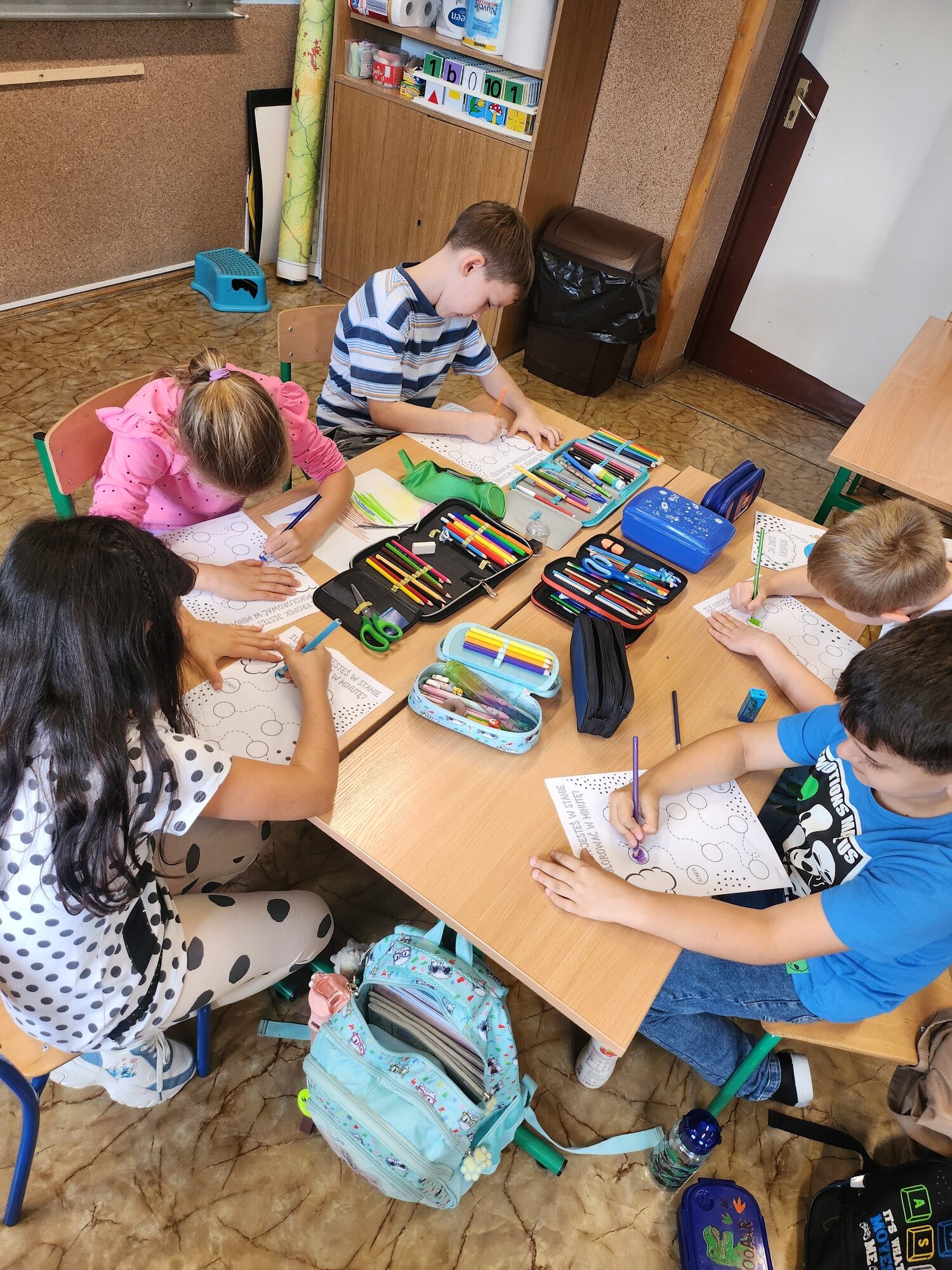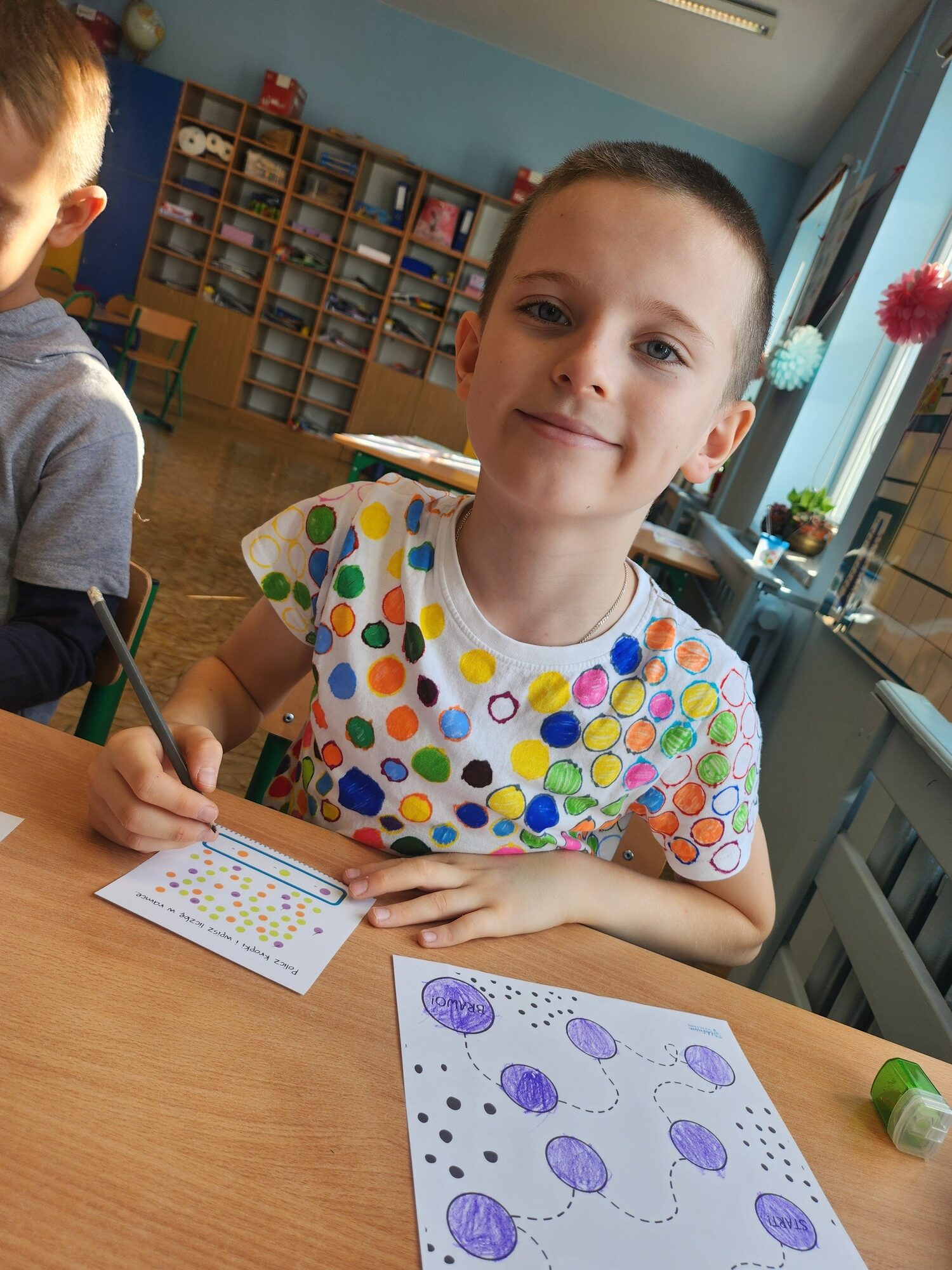 Nie zabrakło też zabawy z matematyką – drugoklasiści rozwiązywali zadania, w których wszystkie działania miały „kropkowy” charakter. Było też kolorowanie kropek na czas, co okazało się świetnym ćwiczeniem spostrzegawczości i refleksu.