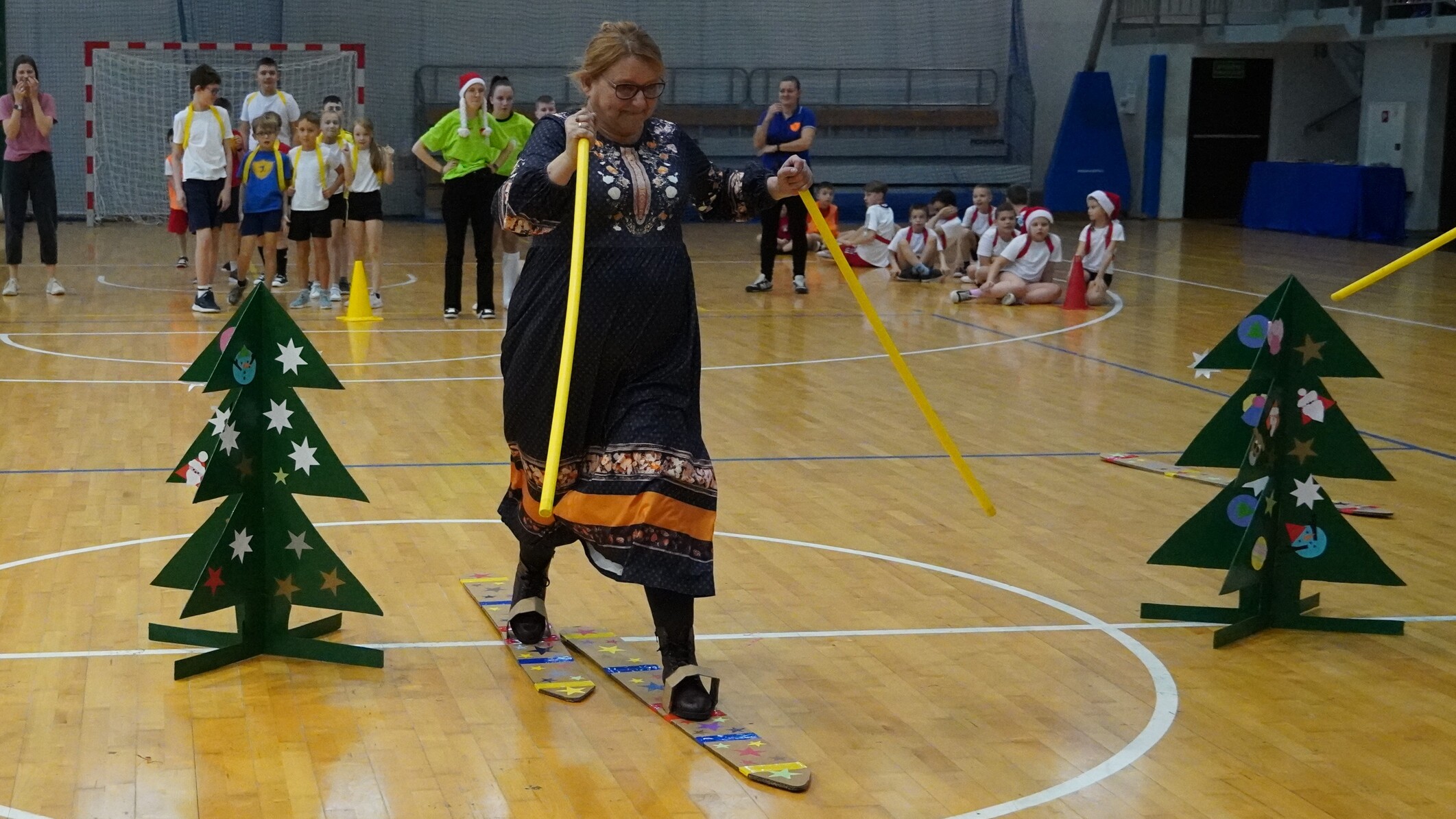 Wiele emocji wzbudziła również konkurencja dla dyrektorów szkół. W wyścigu na nartach panie dyrektor udowodniły, że potrafią nie tylko zarządzać placówkami, ale także z odwagą i uśmiechem stawać w sportowe szranki. Naszą szkołę reprezentowała pani dyrektor Agnieszka Trzeszczak, którą dopingowaliśmy z dumą i ogromnym zaangażowaniem.