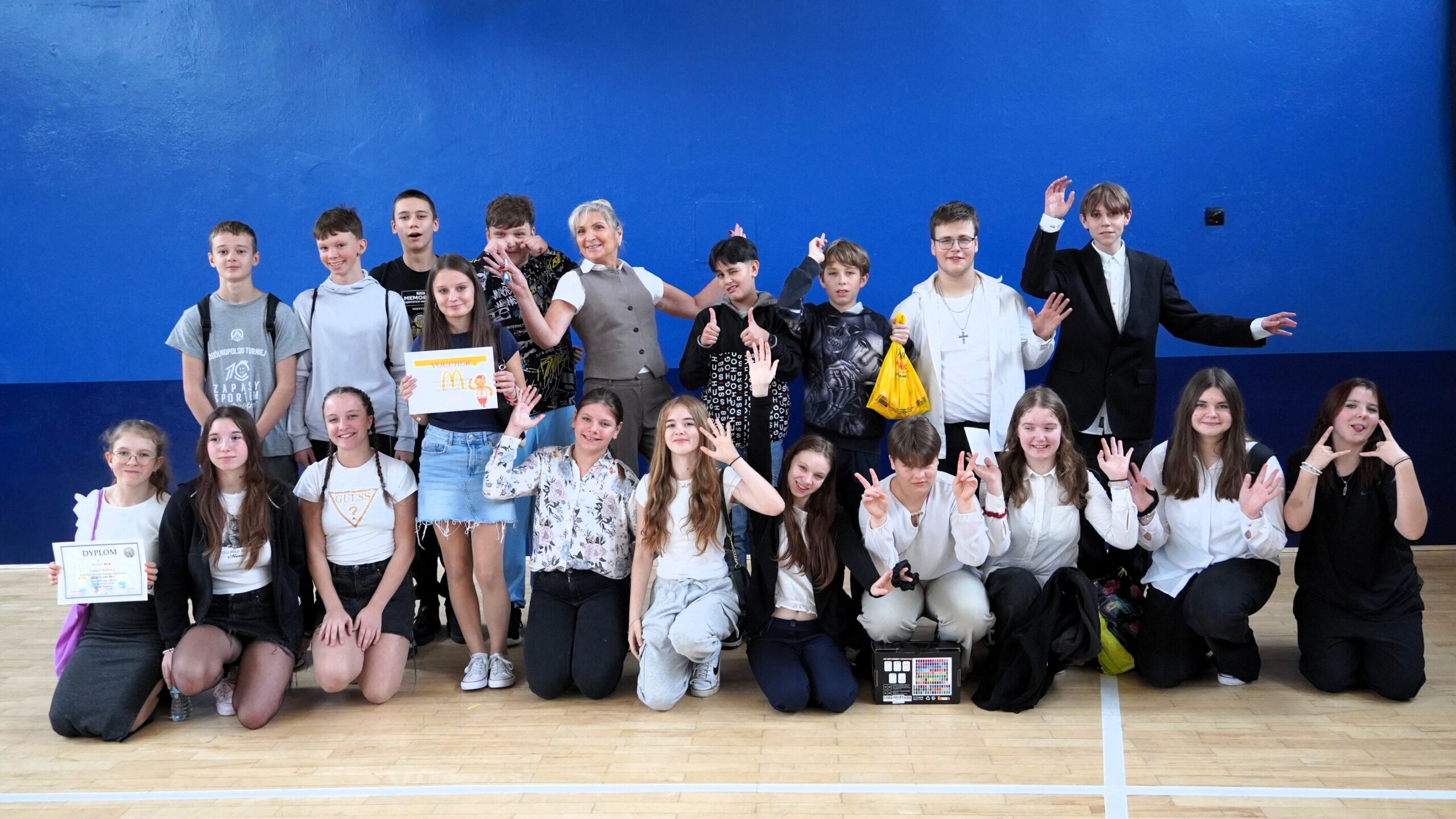 Po podsumowaniu wszystkich konkurencji jury, pod przewodnictwem pani dyrektor, ogłosiło, że tytuł „Zgranej Klasy” zdobyła klasa VII A. W nagrodę uczniowie otrzymali voucher na lody do restauracji McDonald’s.
