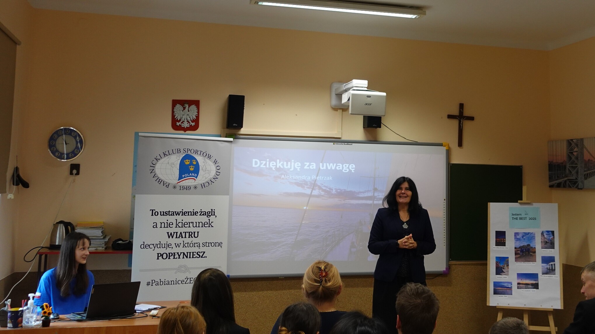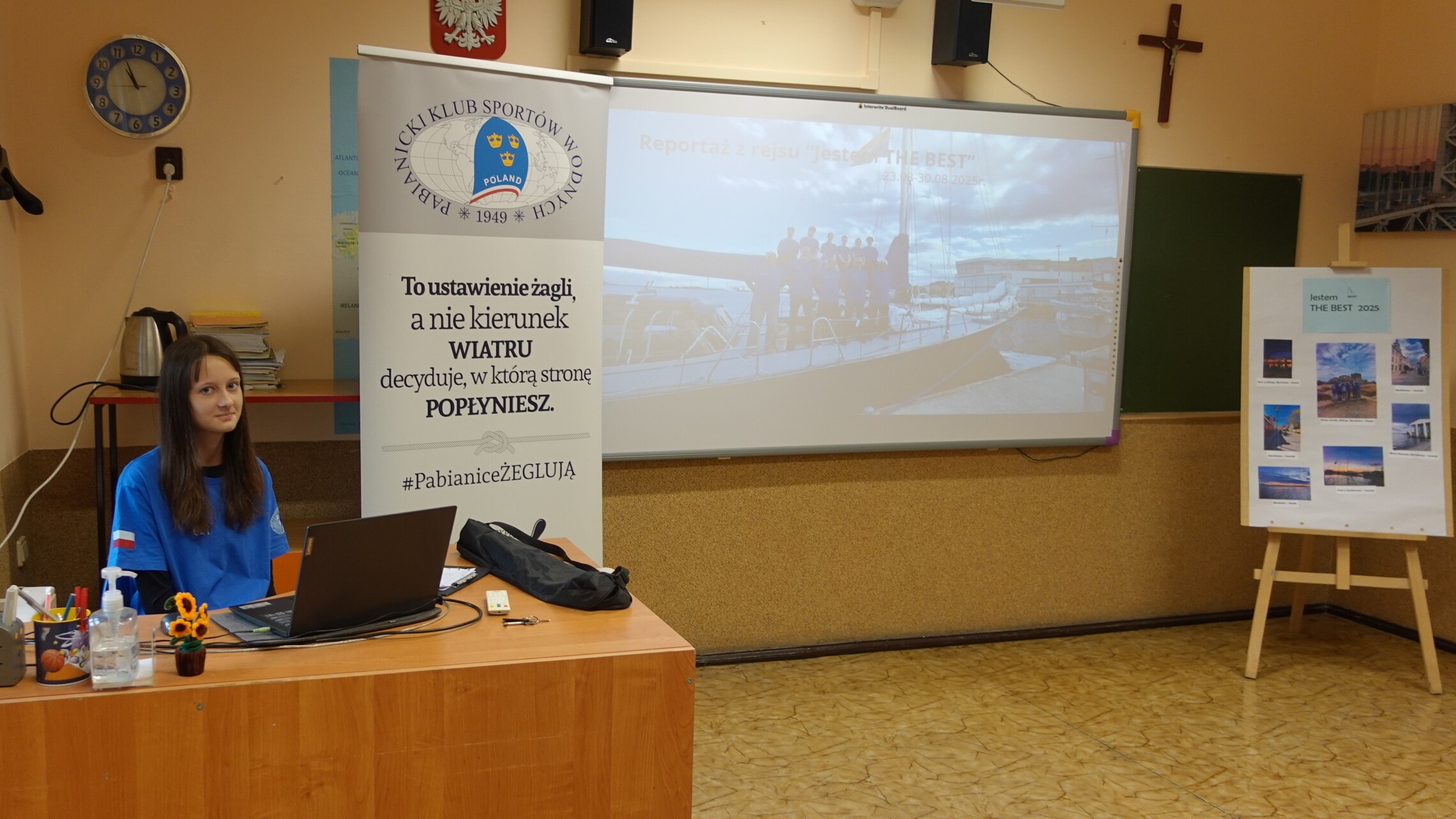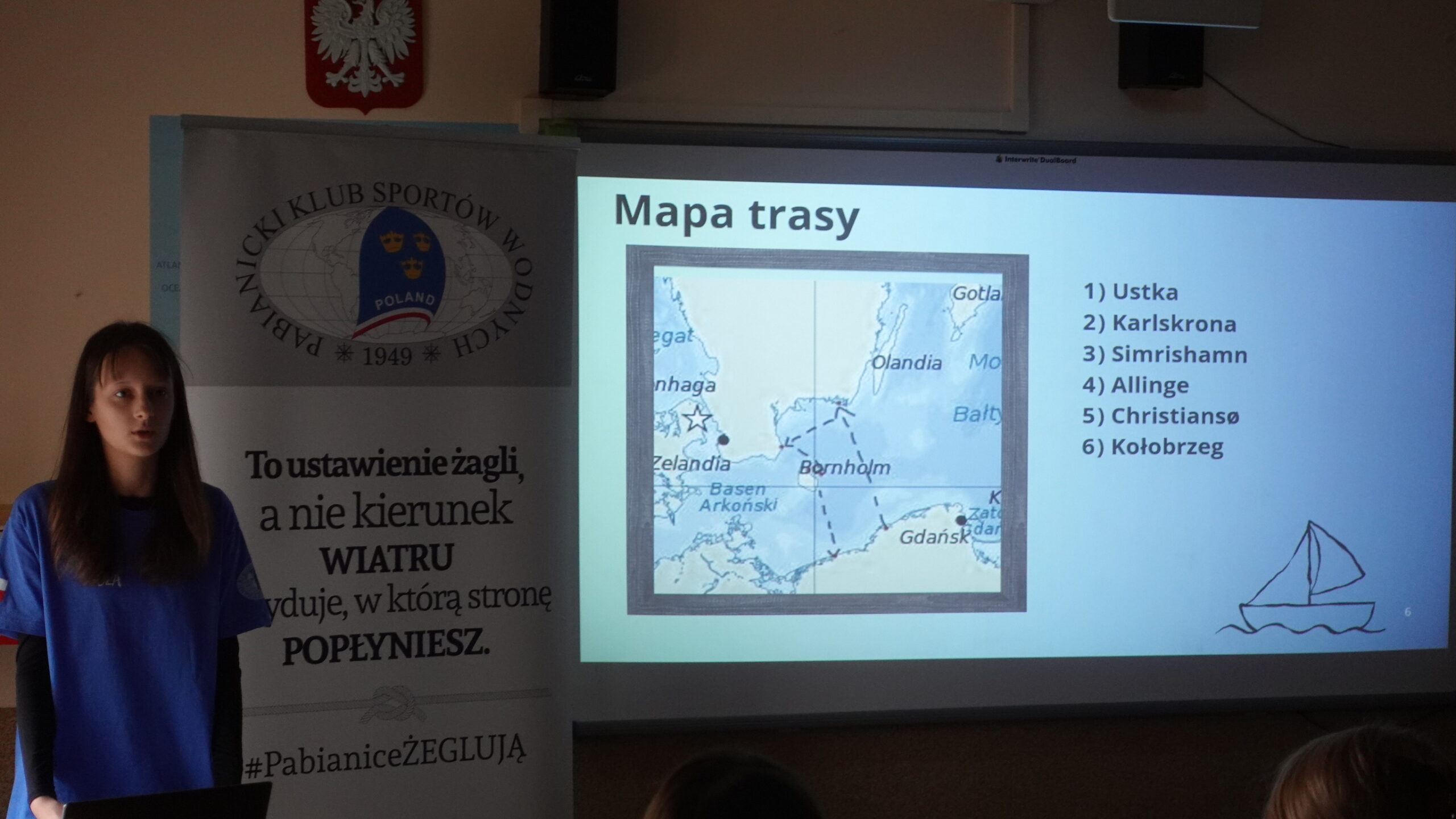 17 października w naszej szkole mieliśmy zaszczyt gościć: Panią Aleksandrę Jarmakowską-Jasiczek – wiceprezydent Miasta Pabianice, kapitana żeglugi Pana Krzysztofa Grzegorka, zastępcę naczelnika Wydziału Edukacji, Kultury i Sportu Pana Marcina Jaworskiego, Panią Anetę Klimek Rzecznika Prasowego Prezydenta Miasta. Powodem wizyty był trzeci i ostatni etap programu edukacyjnego pn.: „Jestem THE BEST” – relacja z rejsu morskiego jachtem żaglowym. W tym miejscu przypomnieć należy, że tegoroczną laureatką konkursu „Jestem THE BEST” została Aleksandra Pietrzak, uczennica klasy ósmej. Nadmieniamy, że Projekt składał się z trzech etapów: przeprowadzonego w maju testu z wiedzy marynistycznej, w którym Ola zdobyła najwięcej punktów wśród kolegów z klasy, rejsu morskiego jachtem żaglowym – głównej nagrody oraz ostatniego etapu – prezentacji swoich wrażeń z rejsu przed zgromadzonymi Gośćmi, kolegami i koleżankami z klasy siódmej. Przygotowany przez Olę reportaż nie tylko przeniósł nas w odległe zakątki Morza Bałtyckiego, pokazał jego bogactwo i piękno, ale także przybliżył nam życie załogi na jachcie żaglowym. Ola swoje wystąpienie posumowała wyznaniem, że udział w rejsie był dla Niej dużym przeżyciem i wyzwaniem, ale gdyby mogła, to chętnie popłynęłaby raz jeszcze. Wydarzenie zakończyło przemówienie Pana kapitana, w którym podkreślił, jak duże znaczenie dla rozwoju świadomych i odważnych przyszłych pokoleń ma edukacja i wychowanie.