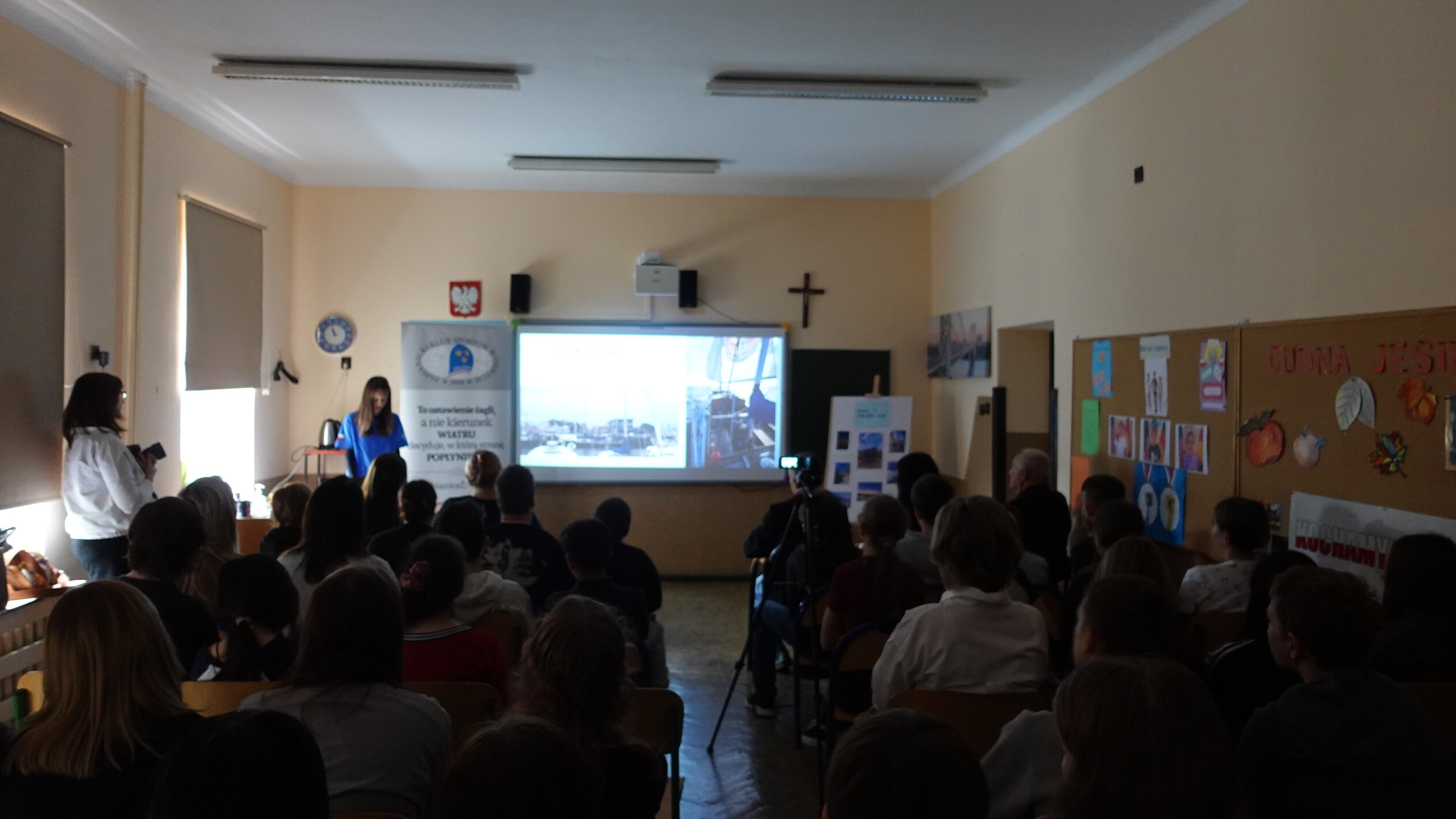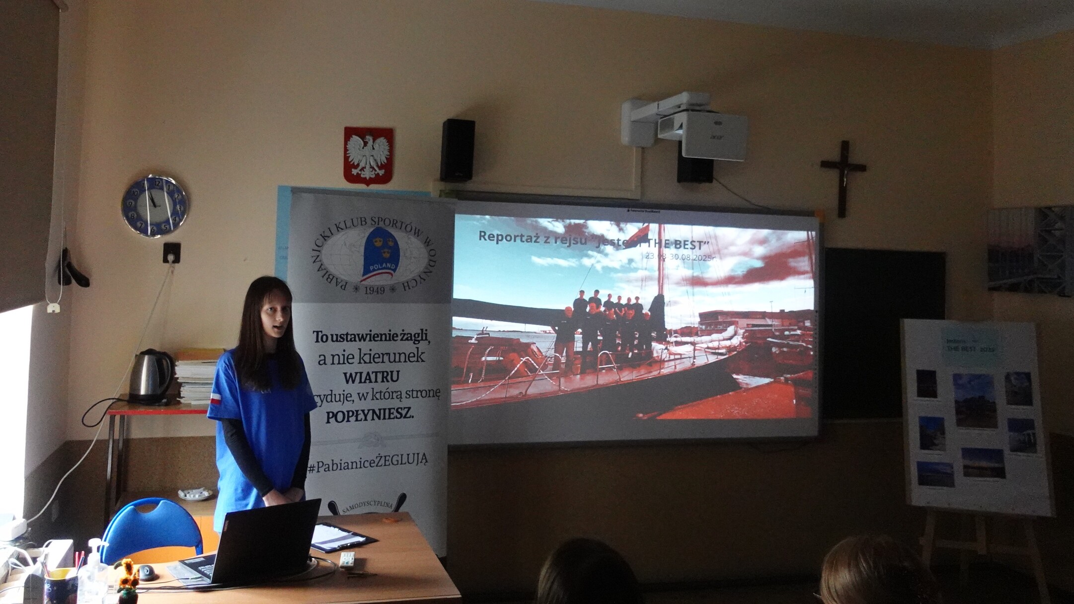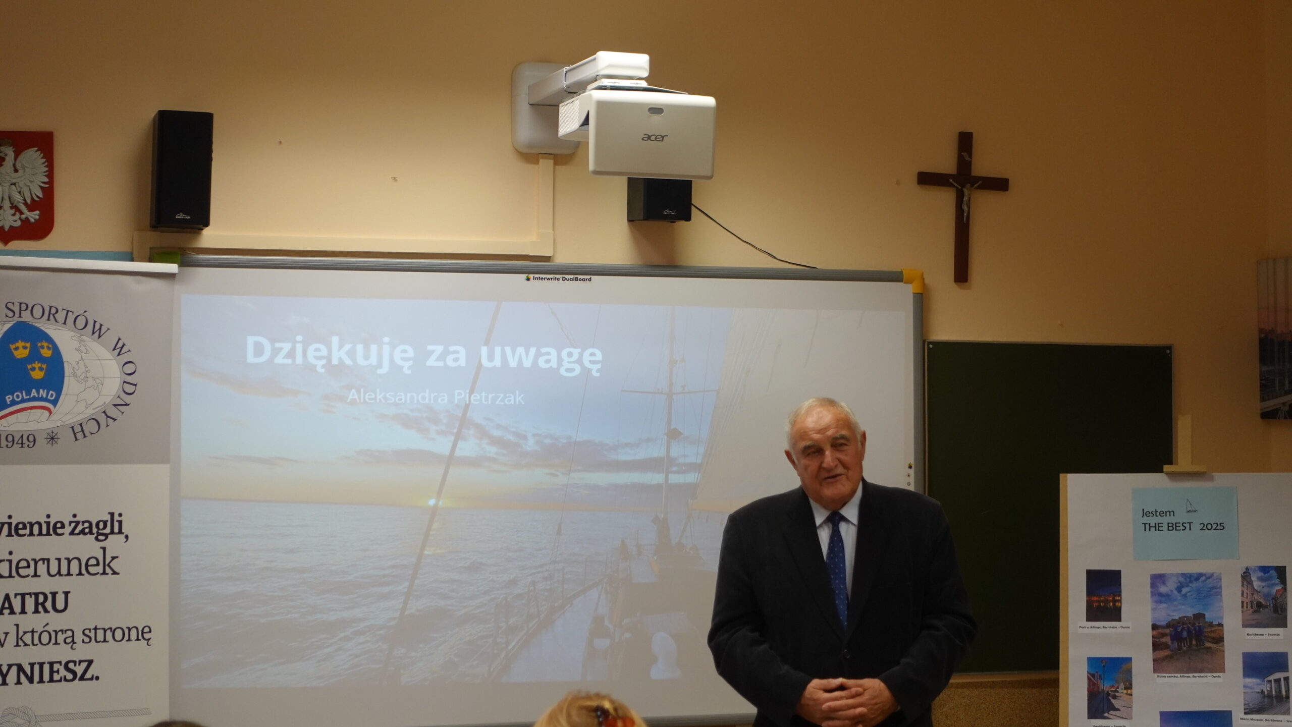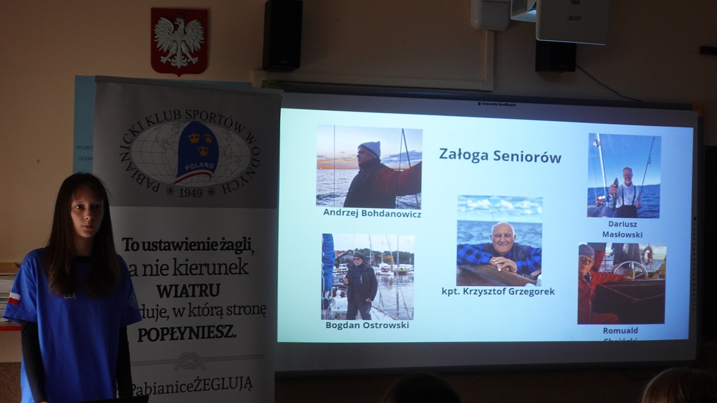17 października w naszej szkole mieliśmy zaszczyt gościć: Panią Aleksandrę Jarmakowską-Jasiczek – wiceprezydent Miasta Pabianice, kapitana żeglugi Pana Krzysztofa Grzegorka, zastępcę naczelnika Wydziału Edukacji, Kultury i Sportu Pana Marcina Jaworskiego, Panią Anetę Klimek Rzecznika Prasowego Prezydenta Miasta. Powodem wizyty był trzeci i ostatni etap programu edukacyjnego pn.: „Jestem THE BEST” – relacja z rejsu morskiego jachtem żaglowym. W tym miejscu przypomnieć należy, że tegoroczną laureatką konkursu „Jestem THE BEST” została Aleksandra Pietrzak, uczennica klasy ósmej. Nadmieniamy, że Projekt składał się z trzech etapów: przeprowadzonego w maju testu z wiedzy marynistycznej, w którym Ola zdobyła najwięcej punktów wśród kolegów z klasy, rejsu morskiego jachtem żaglowym – głównej nagrody oraz ostatniego etapu – prezentacji swoich wrażeń z rejsu przed zgromadzonymi Gośćmi, kolegami i koleżankami z klasy siódmej. Przygotowany przez Olę reportaż nie tylko przeniósł nas w odległe zakątki Morza Bałtyckiego, pokazał jego bogactwo i piękno, ale także przybliżył nam życie załogi na jachcie żaglowym. Ola swoje wystąpienie posumowała wyznaniem, że udział w rejsie był dla Niej dużym przeżyciem i wyzwaniem, ale gdyby mogła, to chętnie popłynęłaby raz jeszcze. Wydarzenie zakończyło przemówienie Pana kapitana, w którym podkreślił, jak duże znaczenie dla rozwoju świadomych i odważnych przyszłych pokoleń ma edukacja i wychowanie.