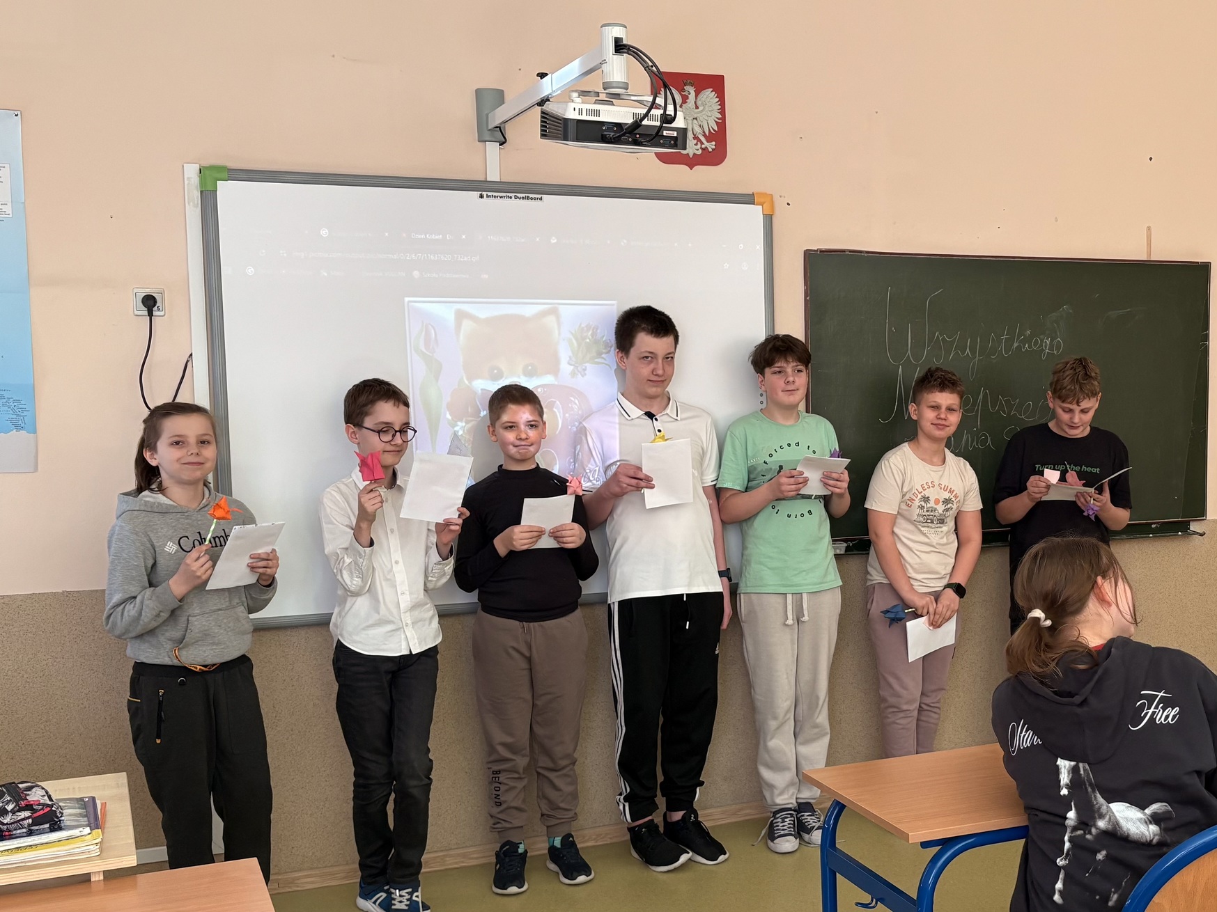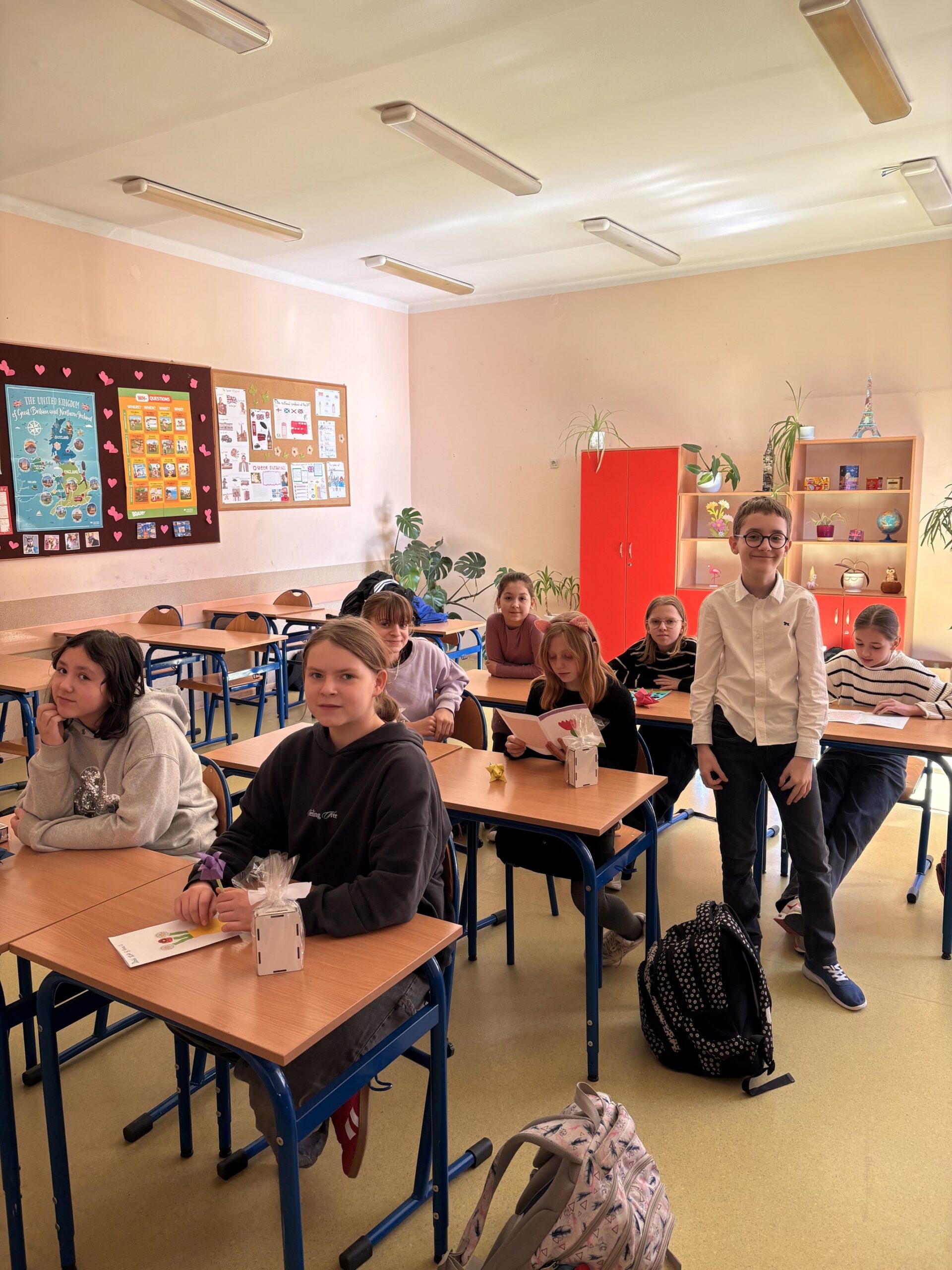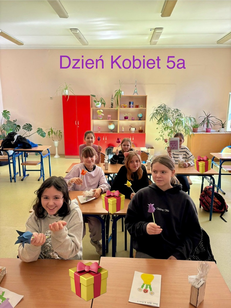 W ostatni piątek uczniowie klasy 5 przygotowali dla swoich koleżanek z klasy małą niespodziankę z okazji Dnia Kobiet. Na początku złożyli życzenia oraz wyrecytowali wiersz. Następnie obdarowali swoje koleżanki samodzielnie wykonanymi laurkami oraz pięknymi tulipanami. Nie zabrakło również pamiątkowej niespodzianki i słodkiego podarunku. Trzeba przyznać, że chłopcy naprawdę się postarali .