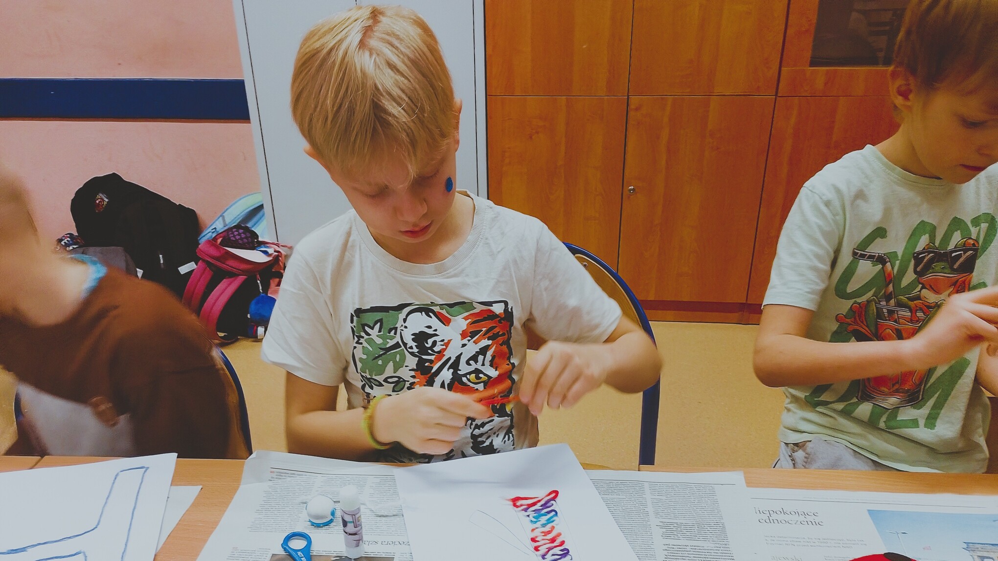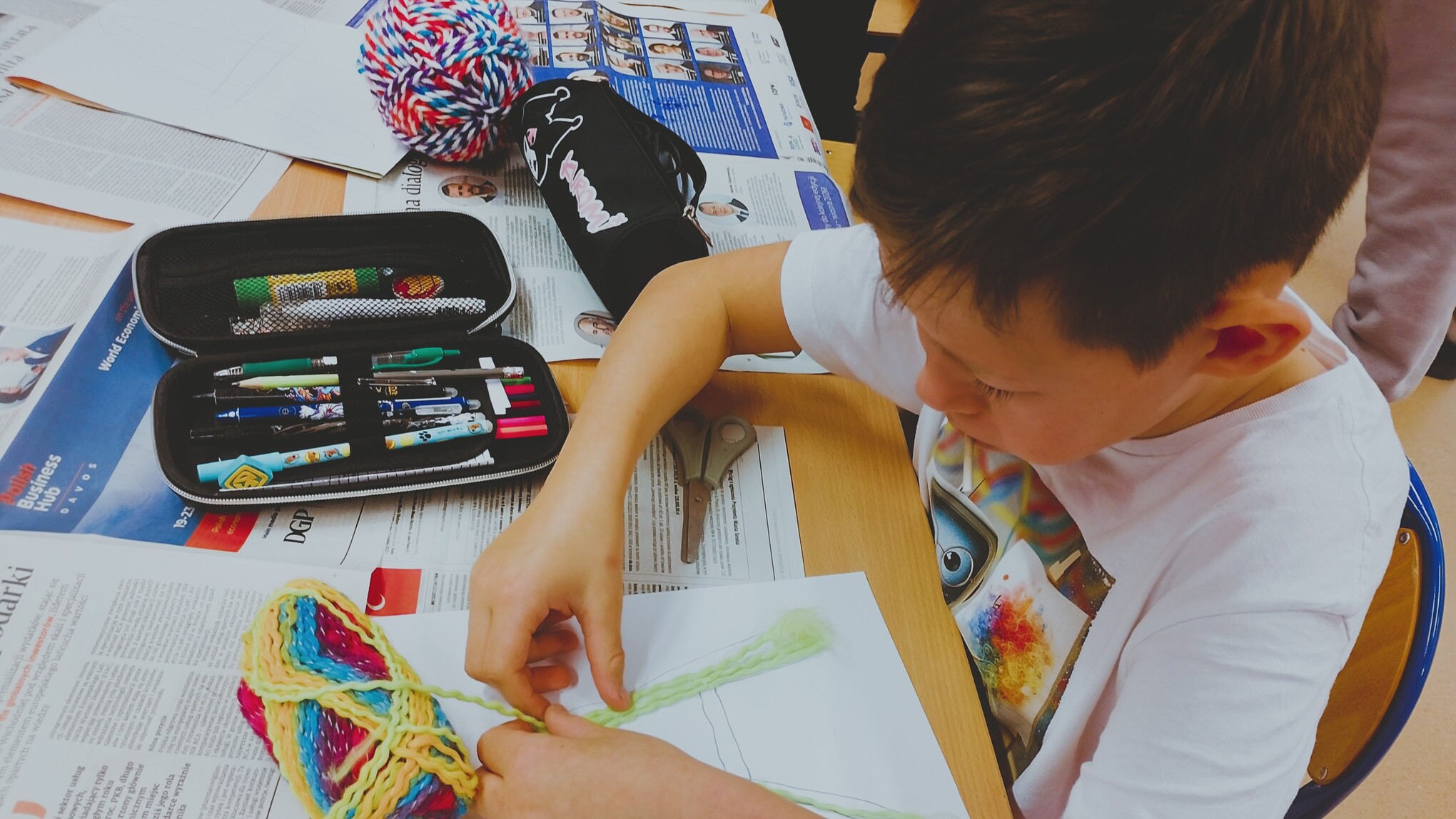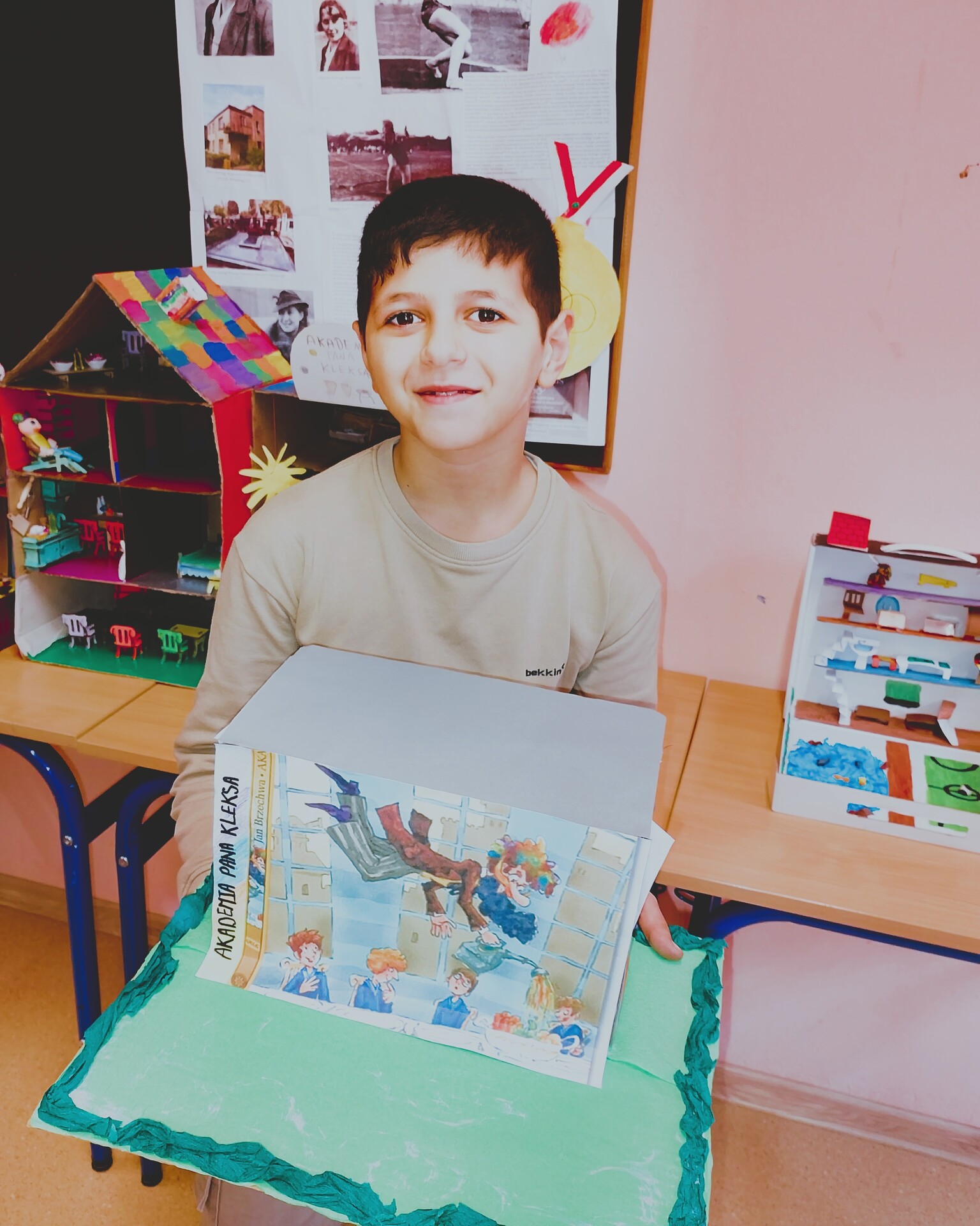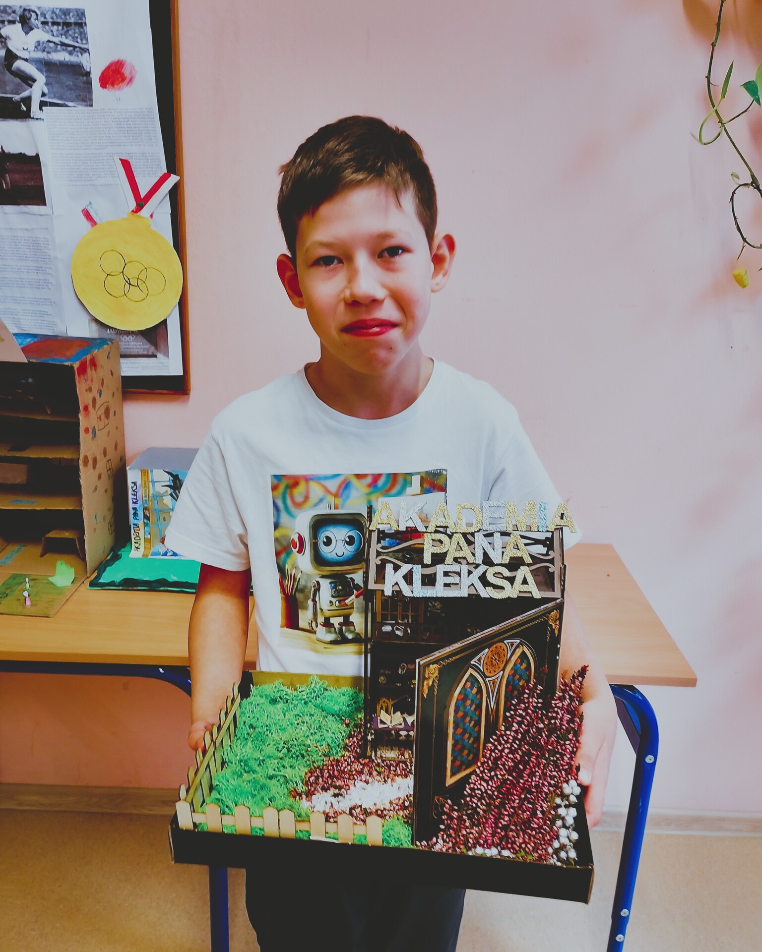 W piątek, 14 listopada odbyła się w naszej szkole niezwykła lekcja języka polskiego. Mając w pamięci omawianą niedawno lekturę, uczniowie klasy 4a postanowili pójść w ślady pana Ambrożego Kleksa i zamiast wertowania podręcznika do literatury wybrali lekcję łączącą elementy kleksografii, przędzenia liter i guzikologii. Niewtajemniczonym lub zapominalskim przypomnijmy, cytując fragment z książki Jana Brzechwy, na czym polegała chociażby lekcja kleksografii: „Kleksografia polega na tym, że na arkuszu papieru robi się kilka kleksów, a potem arkusz składa się na pół i kleksy rozmazują się na papierze, przybierając kształty rozmaitych figur, zwierząt, postaci. Do nich dopisujemy odpowiednie historyjki (…)” ( J. Brzechwa „Akademia pana Kleksa”). Wszyscy uczniowie klasy 4a świetnie się bawili, z radością odkrywając symetrycznie odbite kształty. Wśród nich pojawiły się motyle, mózgi, ryby, ptaki, a nawet egzotyczne kraje i starożytne bóstwa. Następnie uczniowie nadawali tytuły swoim „kleksom – obrazkom” i opisywali je w kliku zdaniach. Wykorzystując różnokolorowe włóczki i wiedzę o lekcji przędzenia liter, wyklejali także inicjały swoich imion. Na koniec sprawdzili umiejętności przyszywania guzików, co okazało się nie lada wyzwaniem! Zajęcia zakończyły eksperymenty z kolorowymi słodyczami, które naśladowały nietypowe upodobania kulinarne osobliwego profesora… Zwieńczenie spotkania z lekturą stanowiły makiety ukazujące budynek akademii: zarówno jego wnętrze, jak i otoczenie. Dzieci wykazały się nie tylko wyjątkową wyobraźnią, ale także zdolnościami plastycznymi i umiejętnościami godnymi pochwały niejednego architekta czy projektanta wnętrz. Serdecznie dziękujemy rodzicom za wsparcie i zaangażowanie w zorganizowanie zajęć. Efekty zarówno lekcji kleksografii, jak i pracy nad makietami akademii możecie podziwiać w galerii poniżej, a od przyszłego poniedziałku także w holu naszej szkoły. Serdecznie zapraszamy!