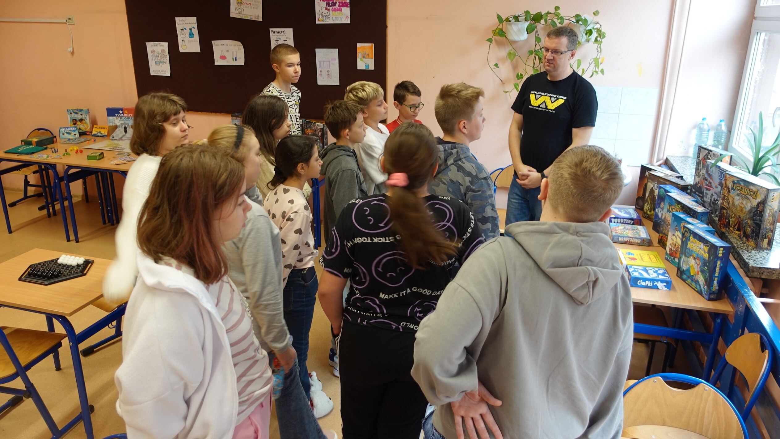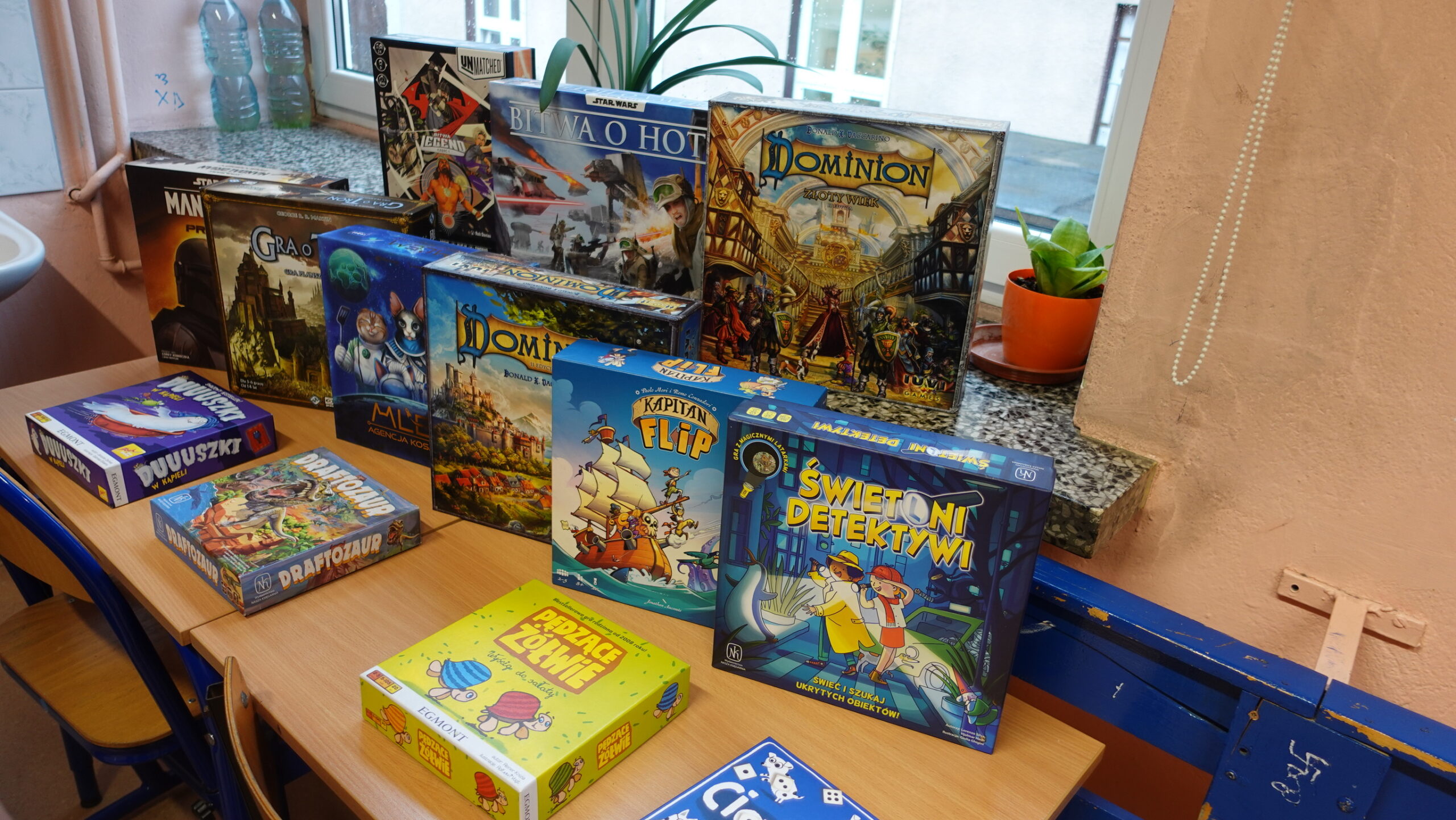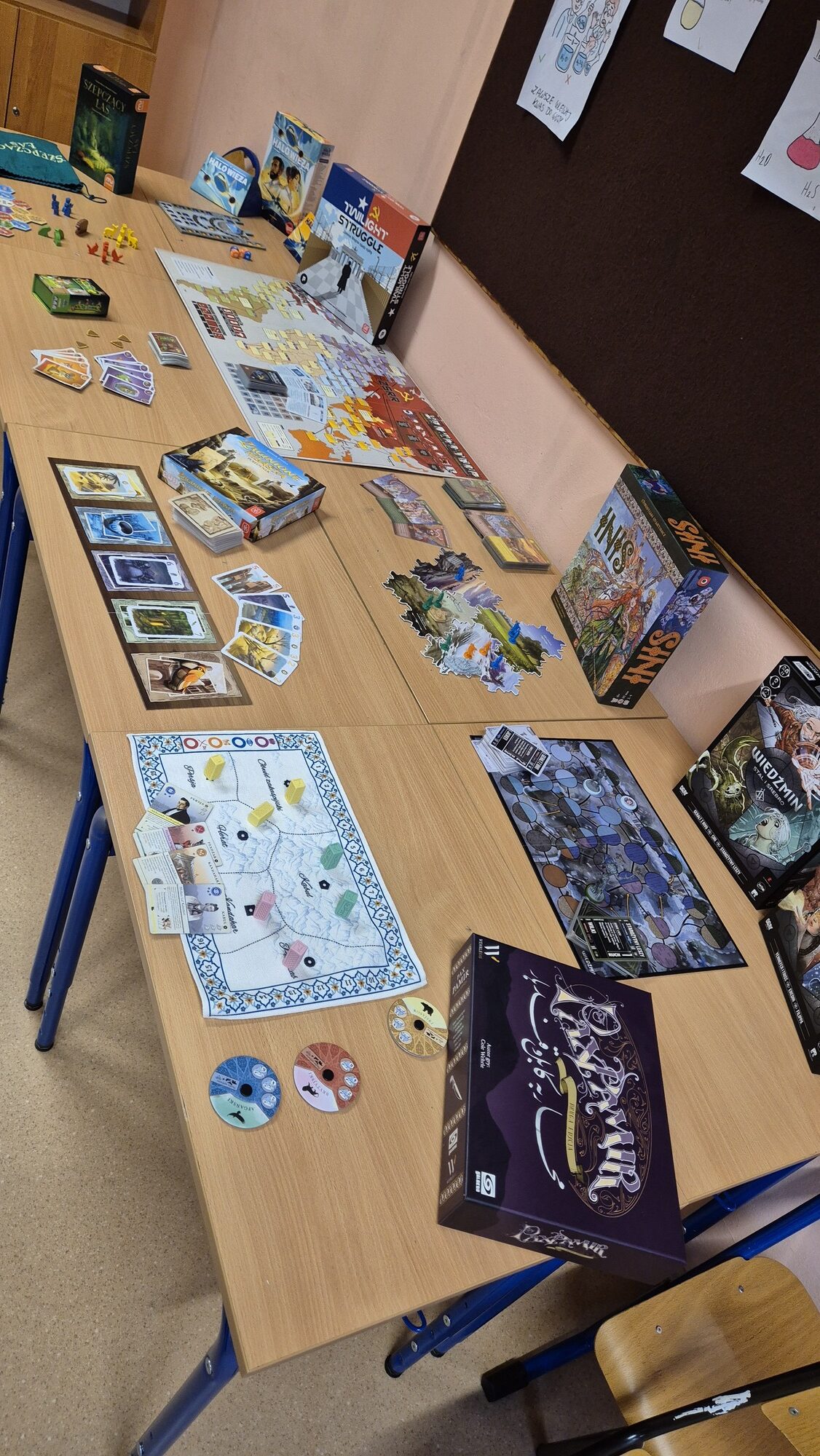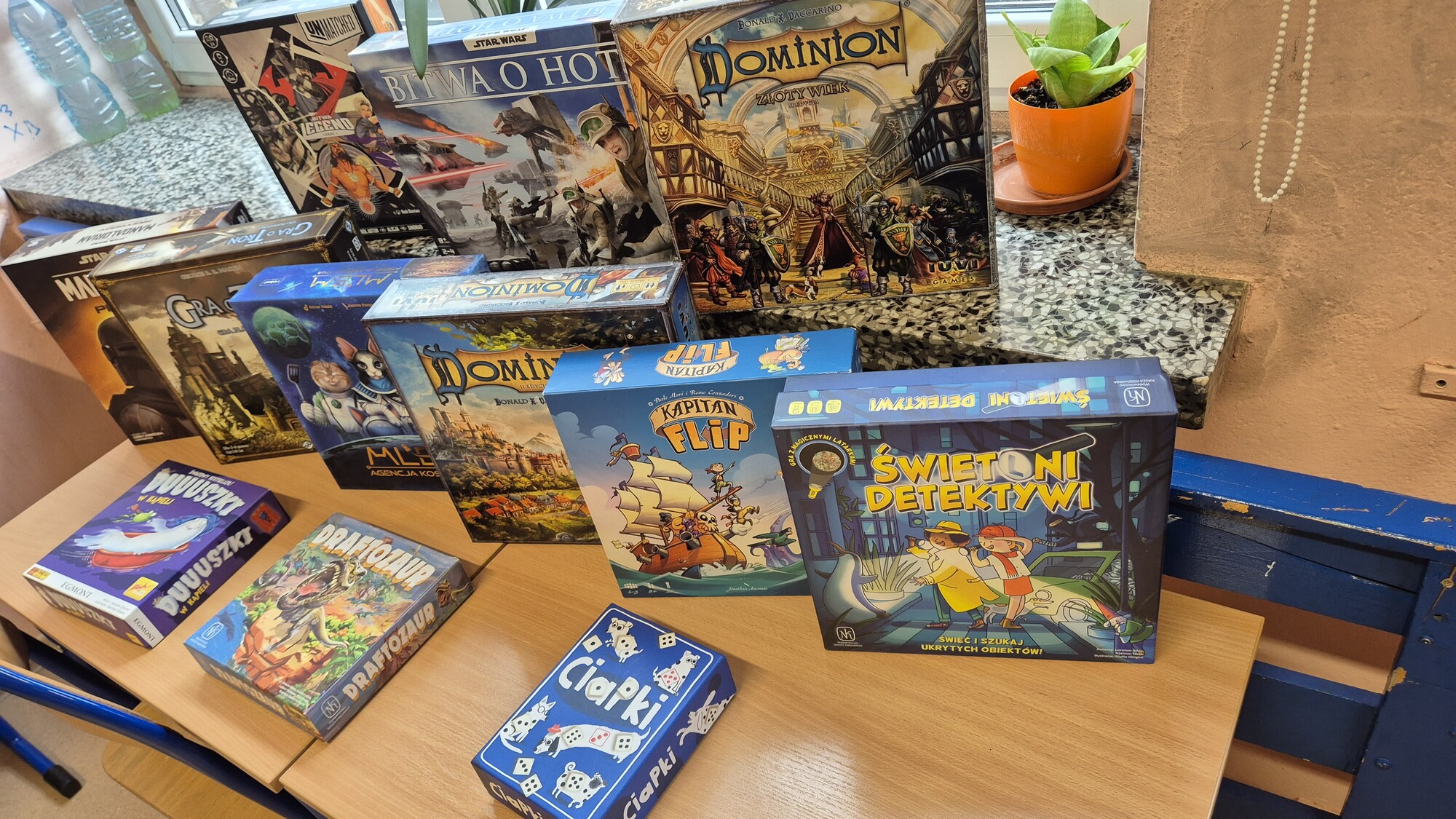 I to właśnie w piątek, 10 października, świętowaliśmy obecność gier planszowych w naszej szkole. Nasi uczniowie i nauczyciele mogli zagrać w gry prostsze i dużo ciekawsze niż Chińczyk oraz zobaczyć wiele innych, różnorodnych tytułów. Od gier przedstawiających konkretne realia historyczne, przez totalne science-fiction, aż do tytułów o tym, kto nabrudził w salonie. Było dużo pytań o różne gry, deklaracje chęci zakupów oraz wielu chętnych do grania na każdej lekcji i przerwie. Zresztą, popatrzcie tylko na zdjęcia.