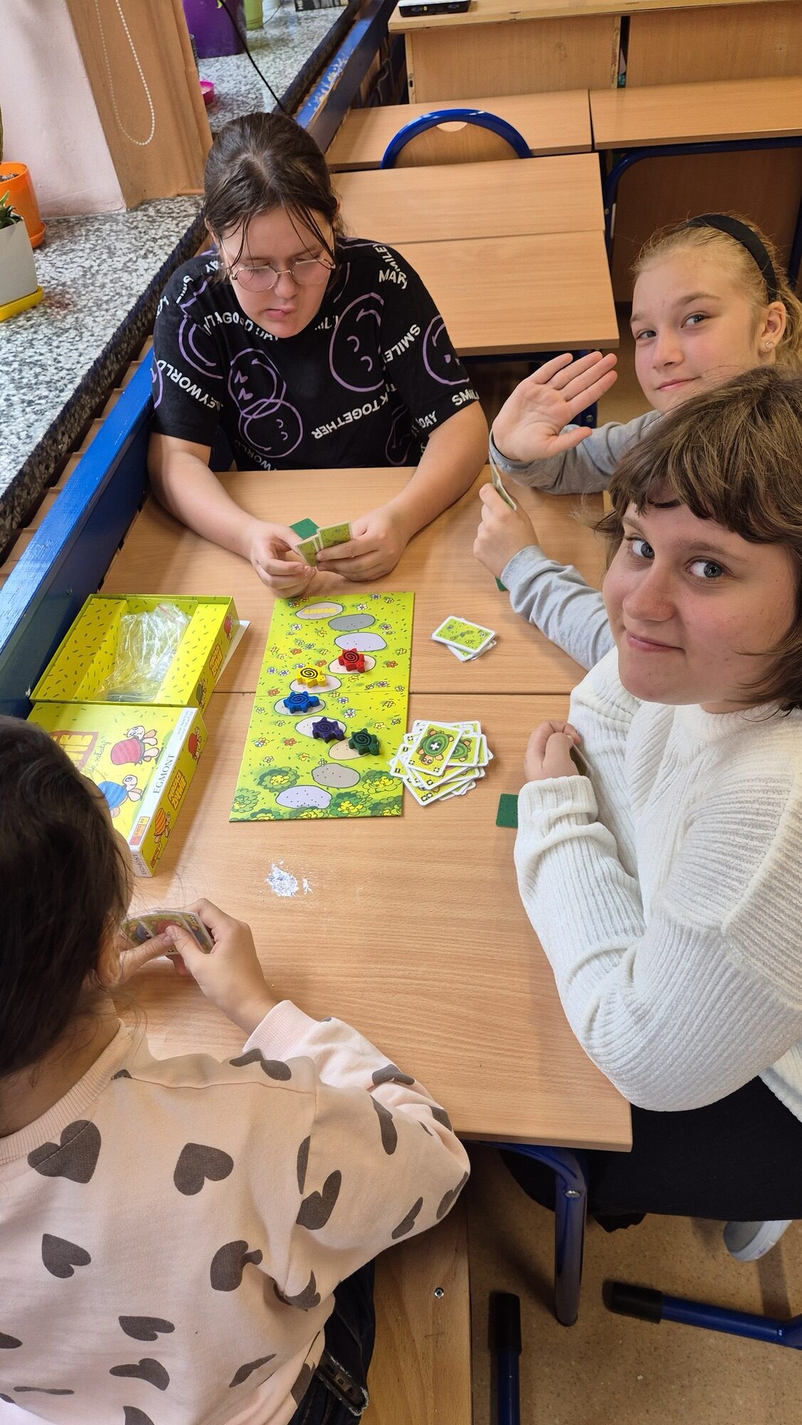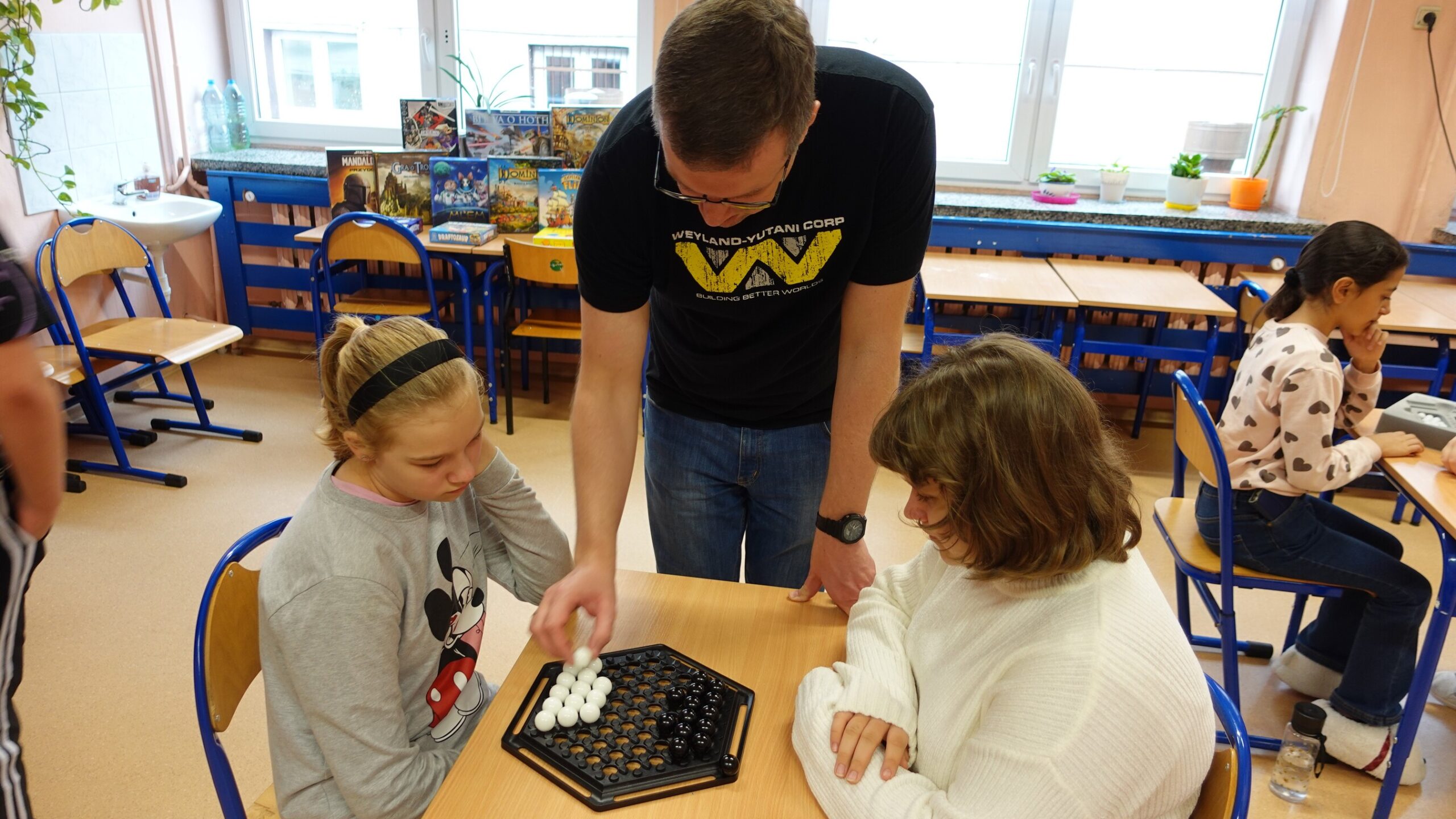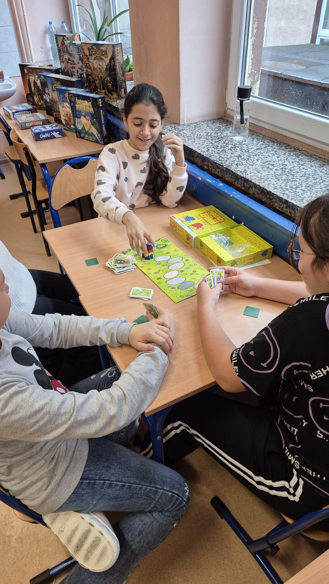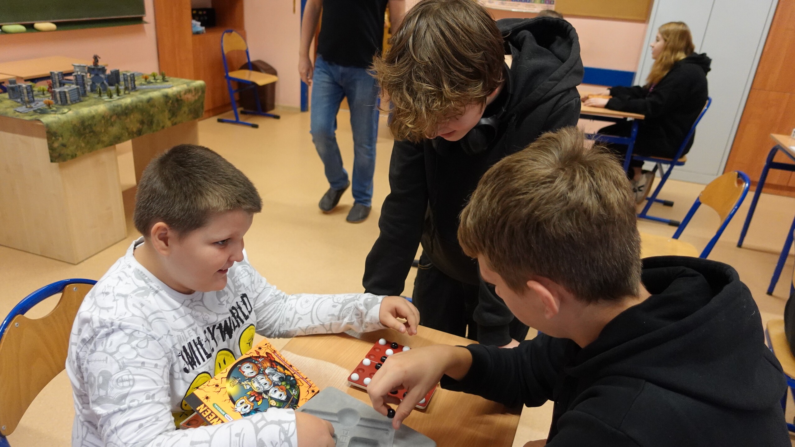 I to właśnie w piątek, 10 października, świętowaliśmy obecność gier planszowych w naszej szkole. Nasi uczniowie i nauczyciele mogli zagrać w gry prostsze i dużo ciekawsze niż Chińczyk oraz zobaczyć wiele innych, różnorodnych tytułów. Od gier przedstawiających konkretne realia historyczne, przez totalne science-fiction, aż do tytułów o tym, kto nabrudził w salonie. Było dużo pytań o różne gry, deklaracje chęci zakupów oraz wielu chętnych do grania na każdej lekcji i przerwie. Zresztą, popatrzcie tylko na zdjęcia.