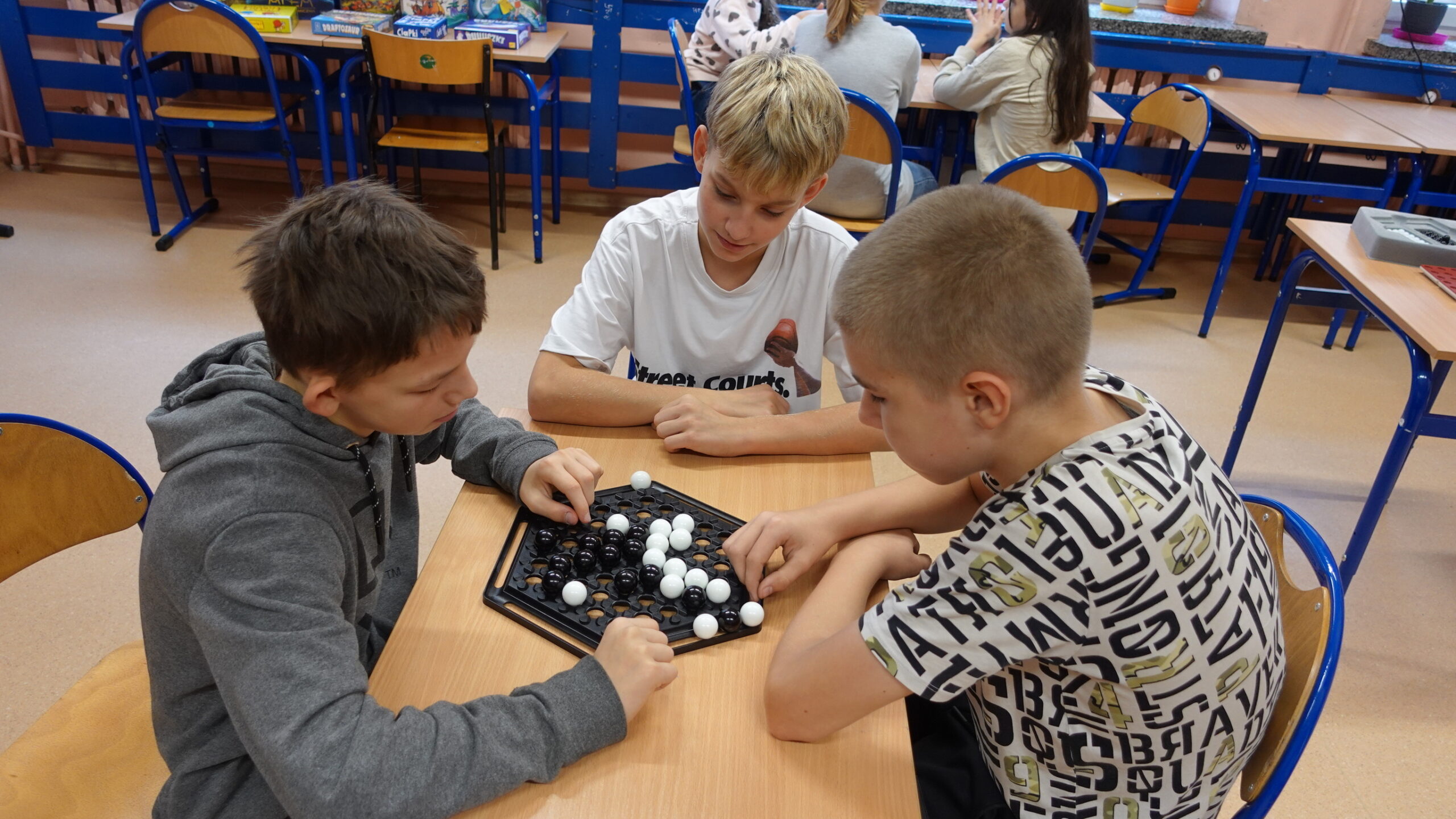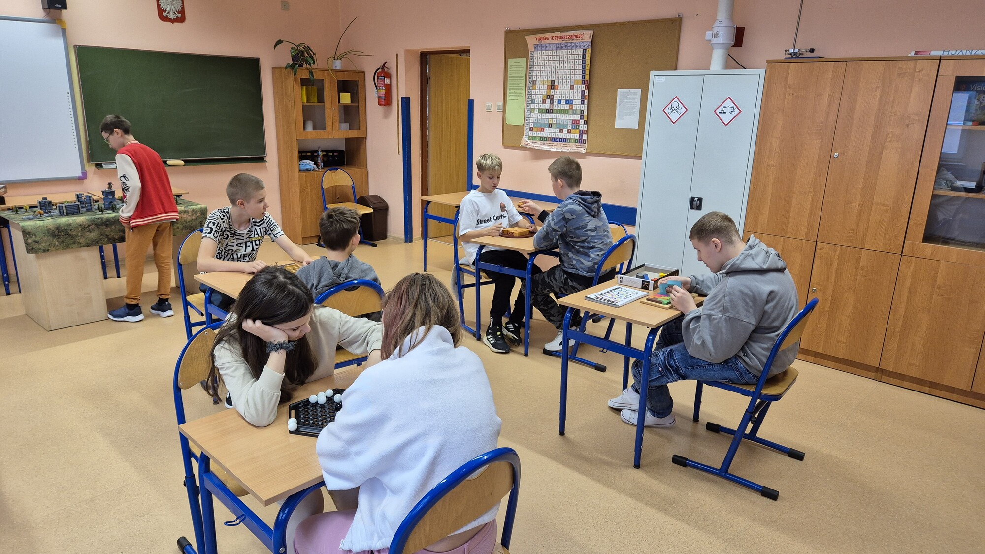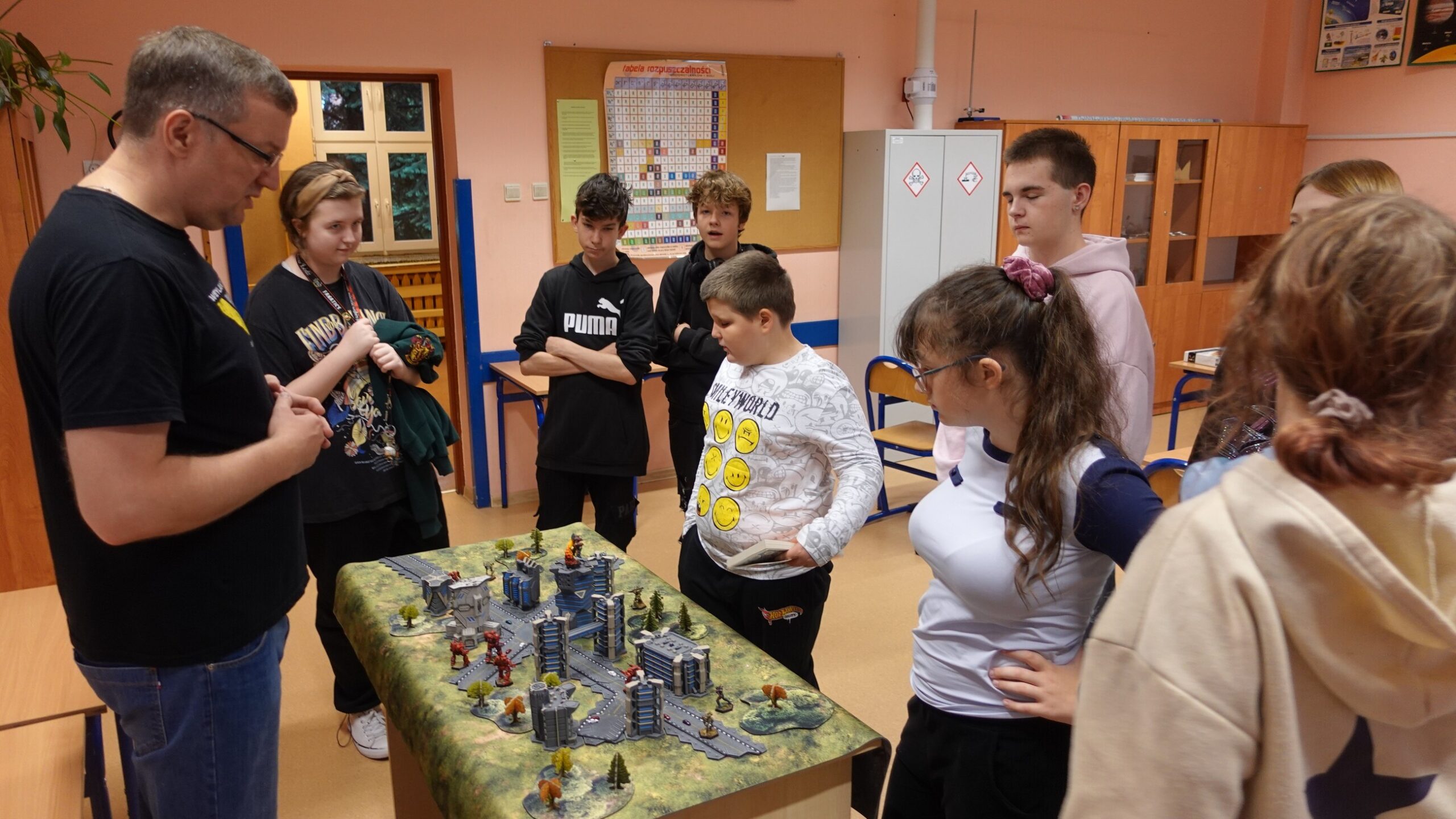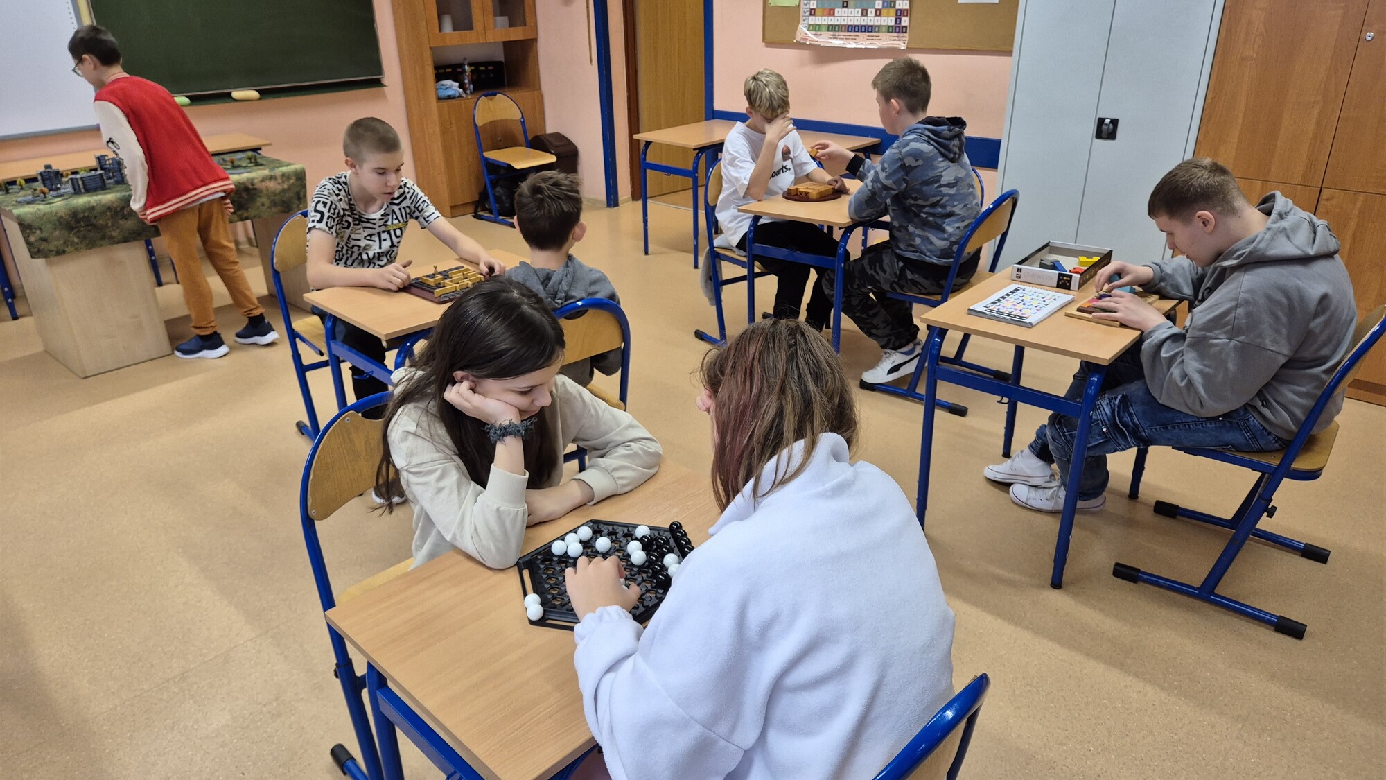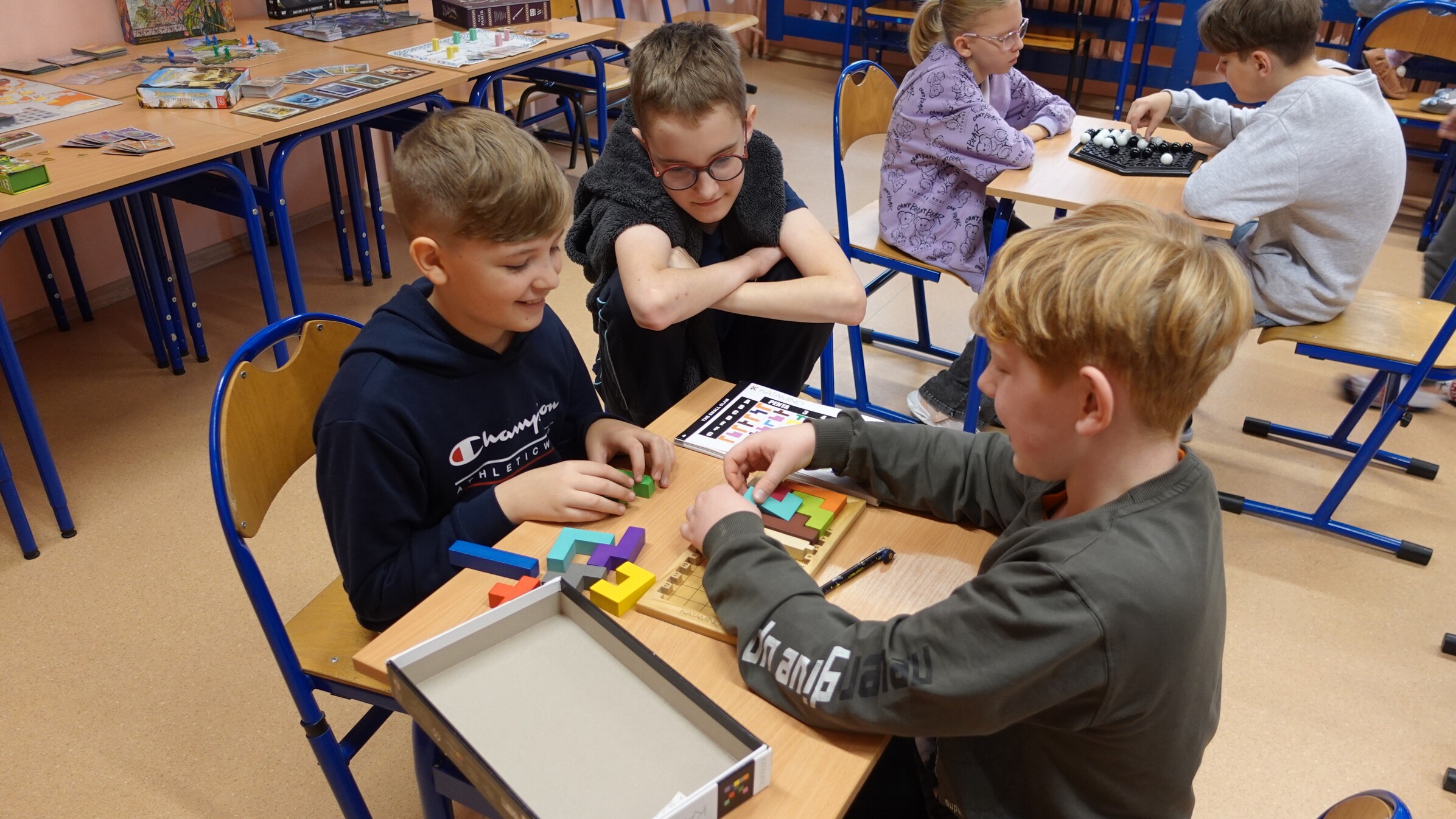 I to właśnie w piątek, 10 października, świętowaliśmy obecność gier planszowych w naszej szkole. Nasi uczniowie i nauczyciele mogli zagrać w gry prostsze i dużo ciekawsze niż Chińczyk oraz zobaczyć wiele innych, różnorodnych tytułów. Od gier przedstawiających konkretne realia historyczne, przez totalne science-fiction, aż do tytułów o tym, kto nabrudził w salonie. Było dużo pytań o różne gry, deklaracje chęci zakupów oraz wielu chętnych do grania na każdej lekcji i przerwie. Zresztą, popatrzcie tylko na zdjęcia.