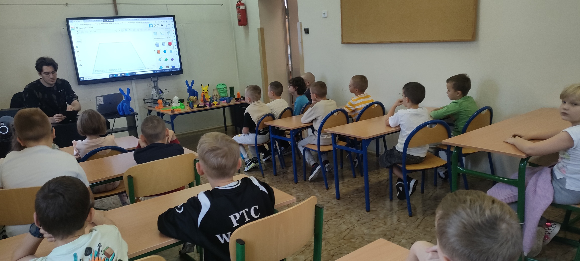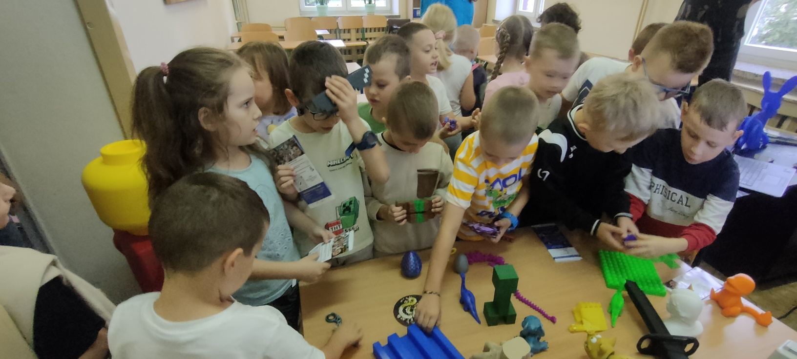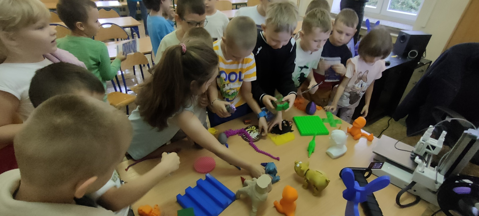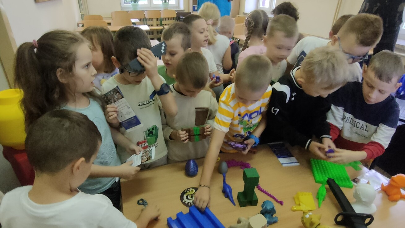 Dnia 16 września klasa pierwsza wzięła udział w spotkaniu z instruktorem, prowadzącym kursy obsługi drukarki 3D. Dzieci były bardzo zaciekawione nową technologią, z uwagą słuchały informacji na temat szerokiego wykorzystania przedstawianego sprzętu. Mogły również obejrzeć i podziwiać prace wytworzone na tych urządzeniach. Po spotkaniu każde dziecko otrzymało drobny prezent, małą zabawkę 3D, którą samodzielnie złożyło.