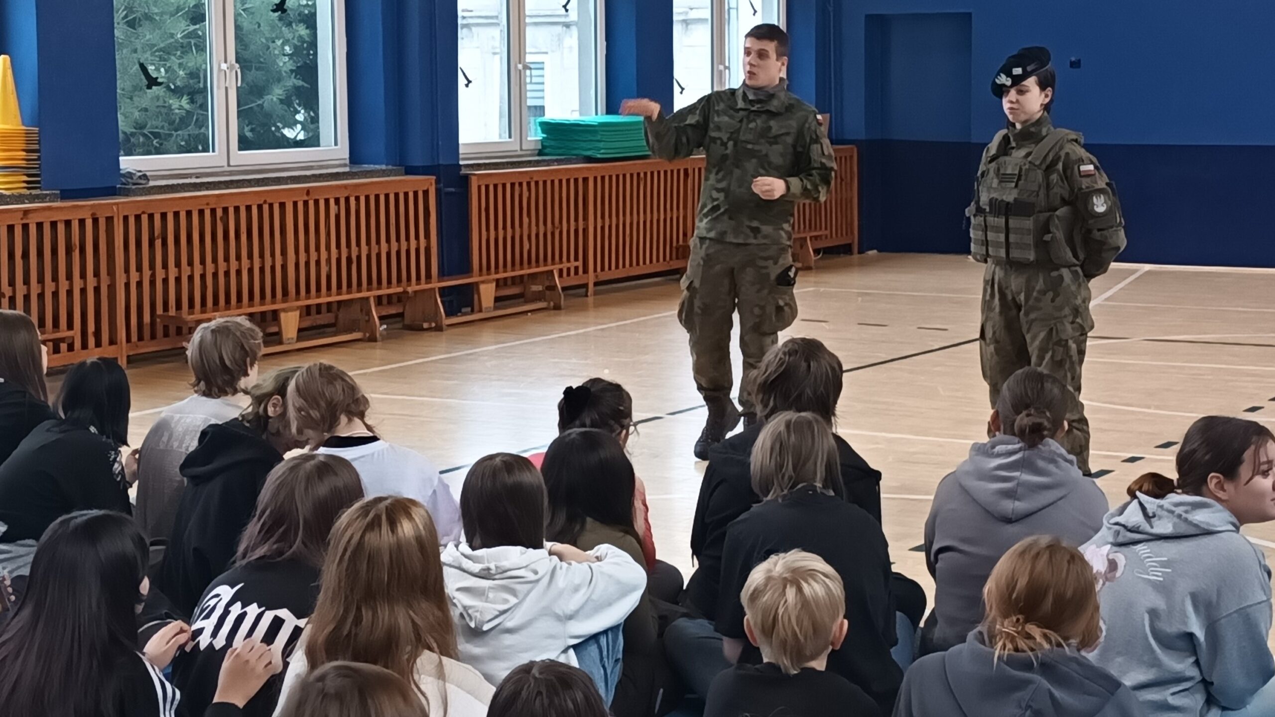 3 grudnia uczniowie klas 7 i klasy 8 spotkali się z przedstawicielami pabianickiego oddziału Związku Rezerwistów Wojska Polskiego. Spotkanie to dało naszym uczniom wyjątkową okazję do poznania specyfiki służby wojskowej oraz różnych form służby w nie tylko w Wojsku Polskim, ale również w policji, żandarmerii wojskowej, straży pożarnej czy straży granicznej. Dzięki zajęciom teoretycznym uczniowie zapoznali się między innymi z zasadami postępowania w sytuacjach zagrożenia, zapoznali się z sygnałami alarmowymi, sposobami udzielania pierwszej pomocy, podstawami ewakuacji i schronienia. Prowadzący szkolenie zaproponowali naszym uczniom również szkolenie praktyczne. Propozycja spotkała się z ogromnym zainteresowaniem uczniów najstarszych klas. Zatem z niecierpliwością czekamy na szkolenie, które odbędzie się już w terenie!